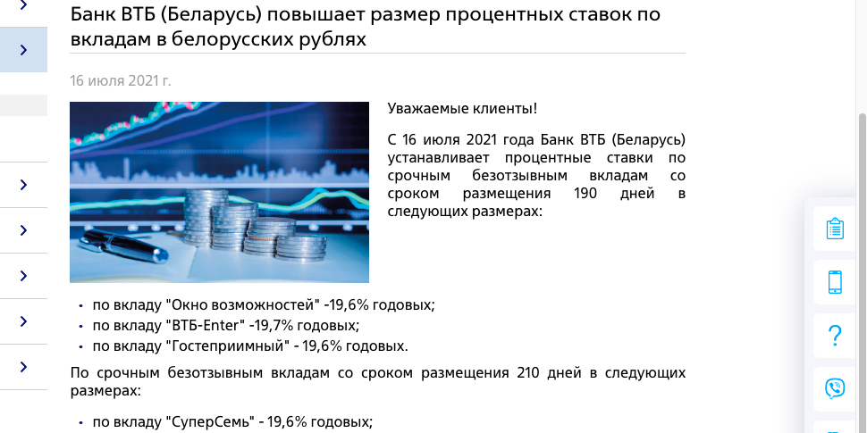 «Банк ВТБ» с 16 июля повысил ставки по безотзывным вкладам в белорусских рублях до 19,6—19,7% годовых.