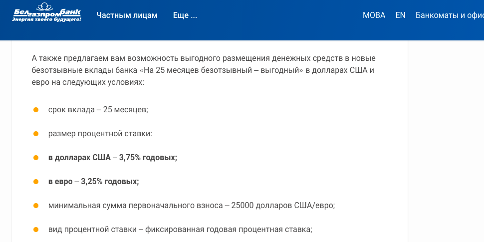 Мы насчитали пять банков, которые сообщили об увеличении процентных ставок по вкладам. В «Белгазпромбанке» с 14 июля повысили ставки по вновь оформляемым безотзывным вкладам в иностранной валюте. Доходность зависит от вида вклада, срока размещения денежных средств и в некоторых случаях — от суммы. Ставки в долларах составляют 2,6—3,75%, в евро 2,4—3,25%, в российских рублях 5,2—9,2%.