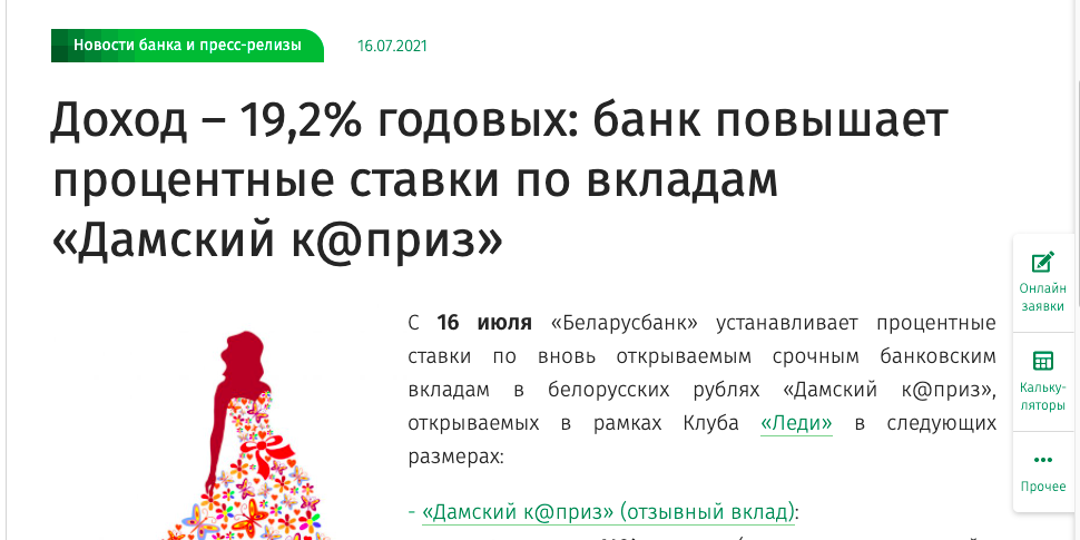 «Беларусбанк» с 16 июля повысил ставки по вновь открываемым вкладам в белорусских рублях «Дамский к@приз». Доходность зависит от вида вклада (отзывный либо безотзывный), а также срока размещения и составляет от 14,5 до 19,2% годовых.