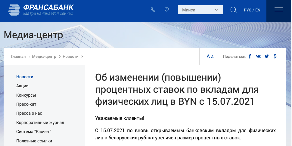 «Франсабанк» с 16 июля увеличил ставки по безотзывным вкладам в белорусских рублях (17,3—19,5%), а также по отзывным и безотзывным депозитам в долларах (1,5—3,5%), евро (1,3—2,9%), российских рублях (6,2—9,2%).