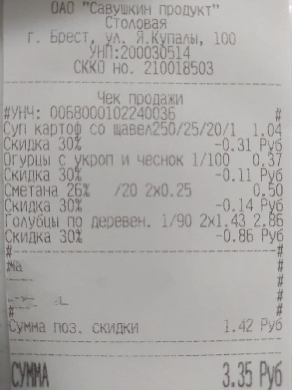 Дмитрий выслал пример обеда работника компании «Савушкин продукт». Сотрудникам предприятия в столовой предоставляется скидка в размере 30%, остальным — по полной стоимости.
