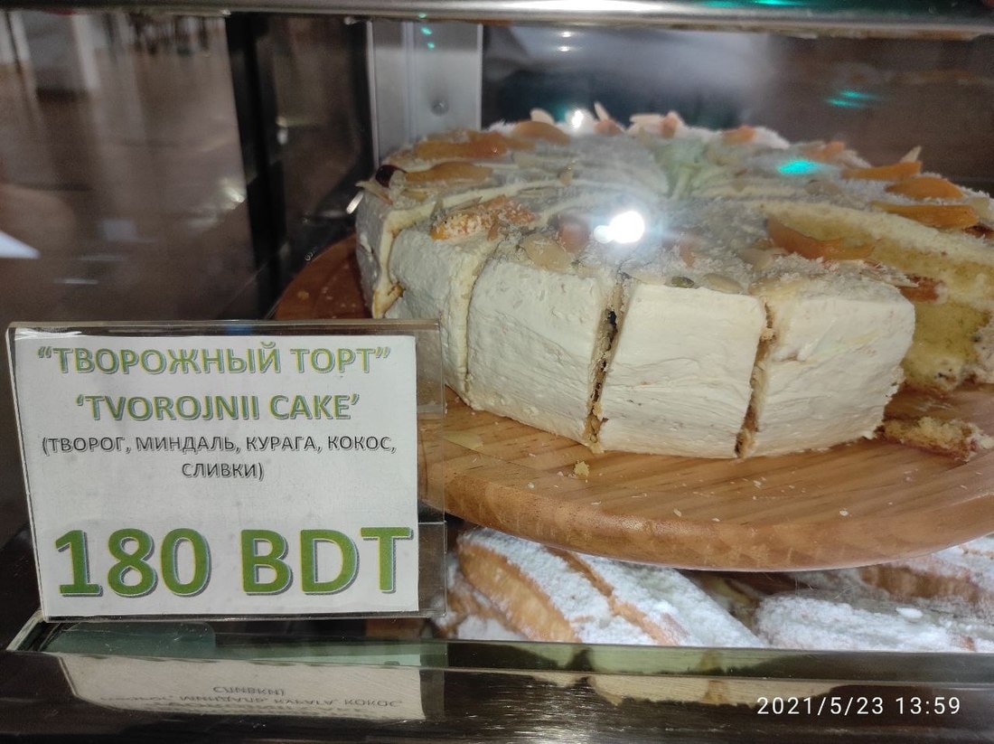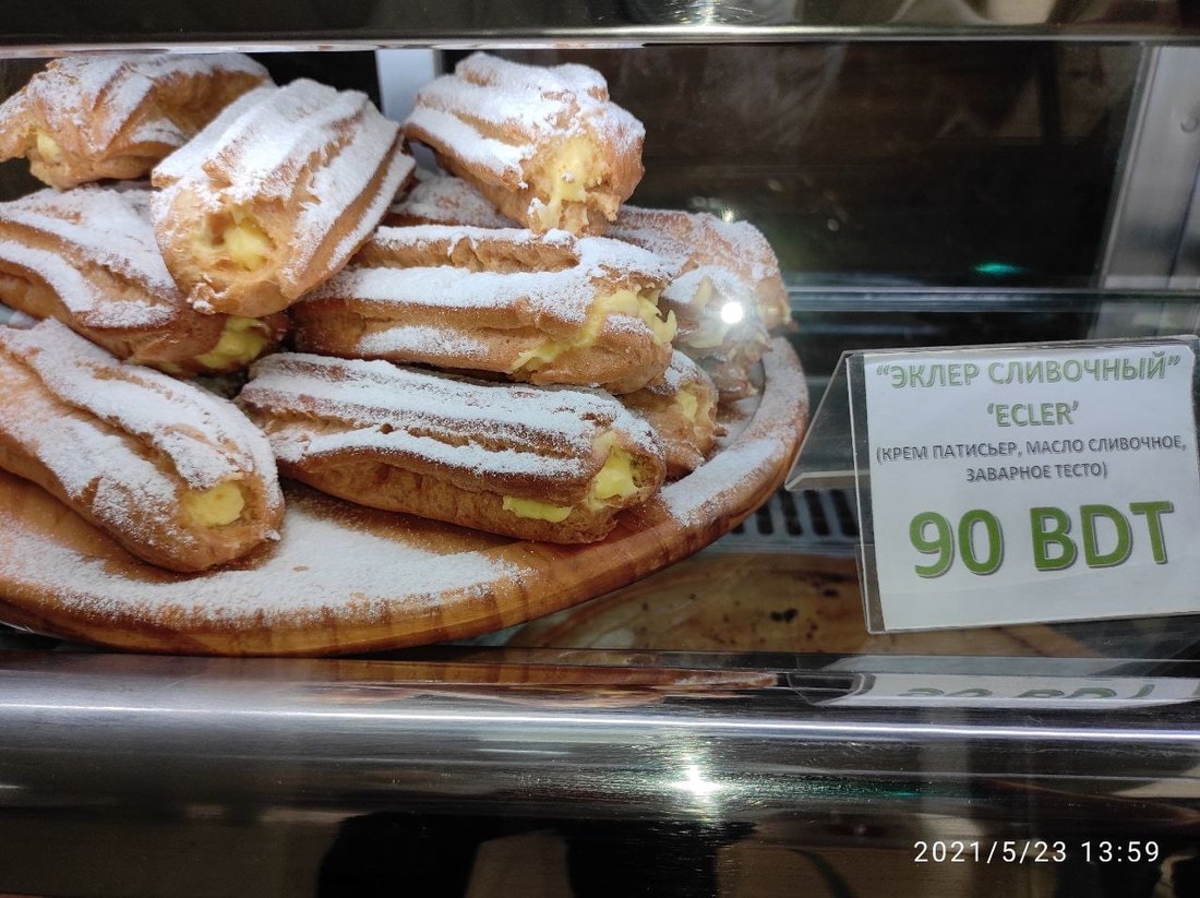 Национальная валюта — бангладешская така, в переводе на рубли 100 так равны 2,96 рубля. Первые блюда стоят от 50 до 120 так (1,5—3,5 рубля), вторые — мясные изделия — 160—180 так (4,7—5,3 рубля), гарнир — 40—70 так (1,2—2,1 рубля), овощные салаты — 50—80 так (1,5—2,4 рубля), мясные 80—130 так (2,4—3,8 рубля), чай — 10 так (30 копеек), растворимый кофе — 15 так (40 копеек), натуральный — 100—170 так (2,9—5 рублей), кондитерские изделия — 80—200 так (2,4—5,9 рубля). Таким образом, на обед, состоящий из первого блюда, гарнира с мясом и овощного салата с чаем, должно уйти примерно 7,7—10,1 рубля.