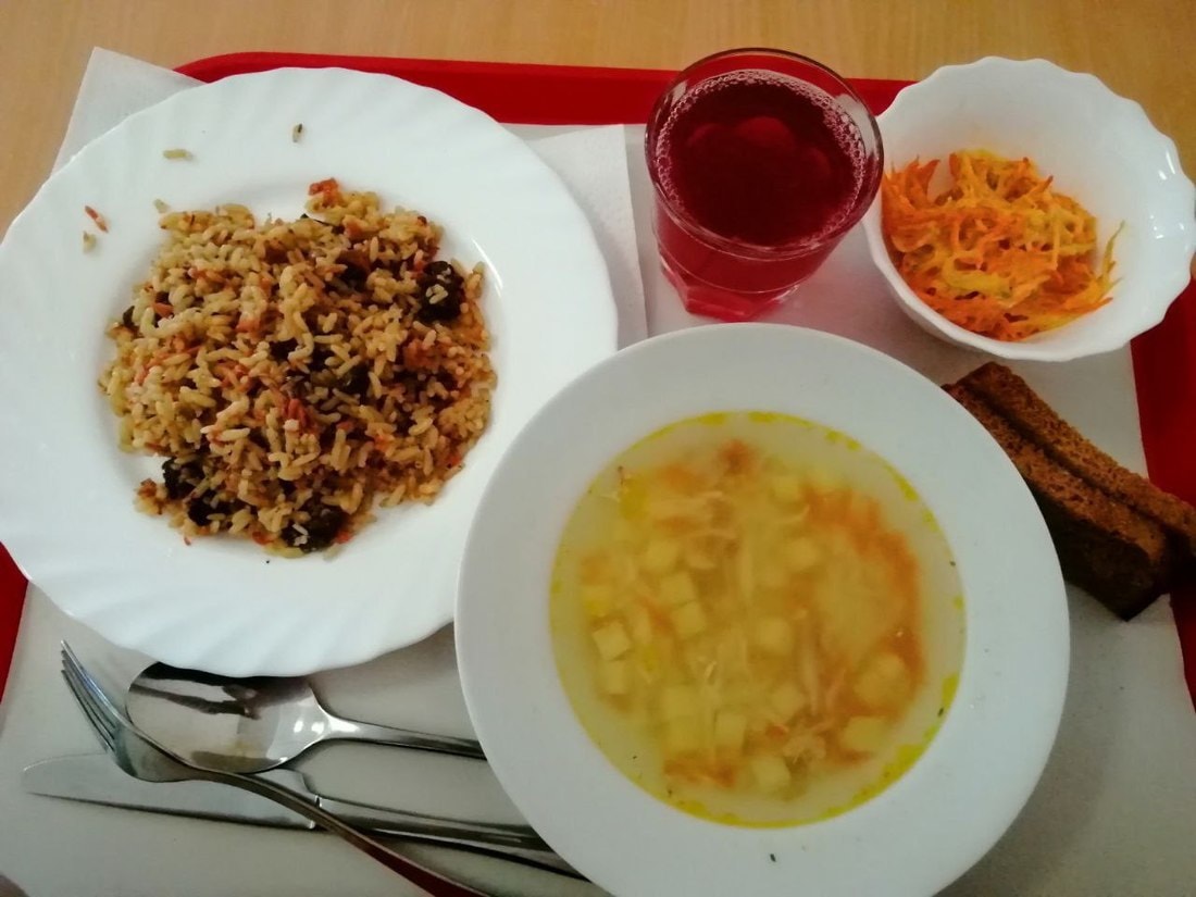 — Здесь есть меню комплексного обеда и меню свободной продажи. Комплексный обед — первое, второе, салат, хлеб, компот. Цена фиксированная — 186 российских рублей, это примерно 6,4 белорусского рубля.