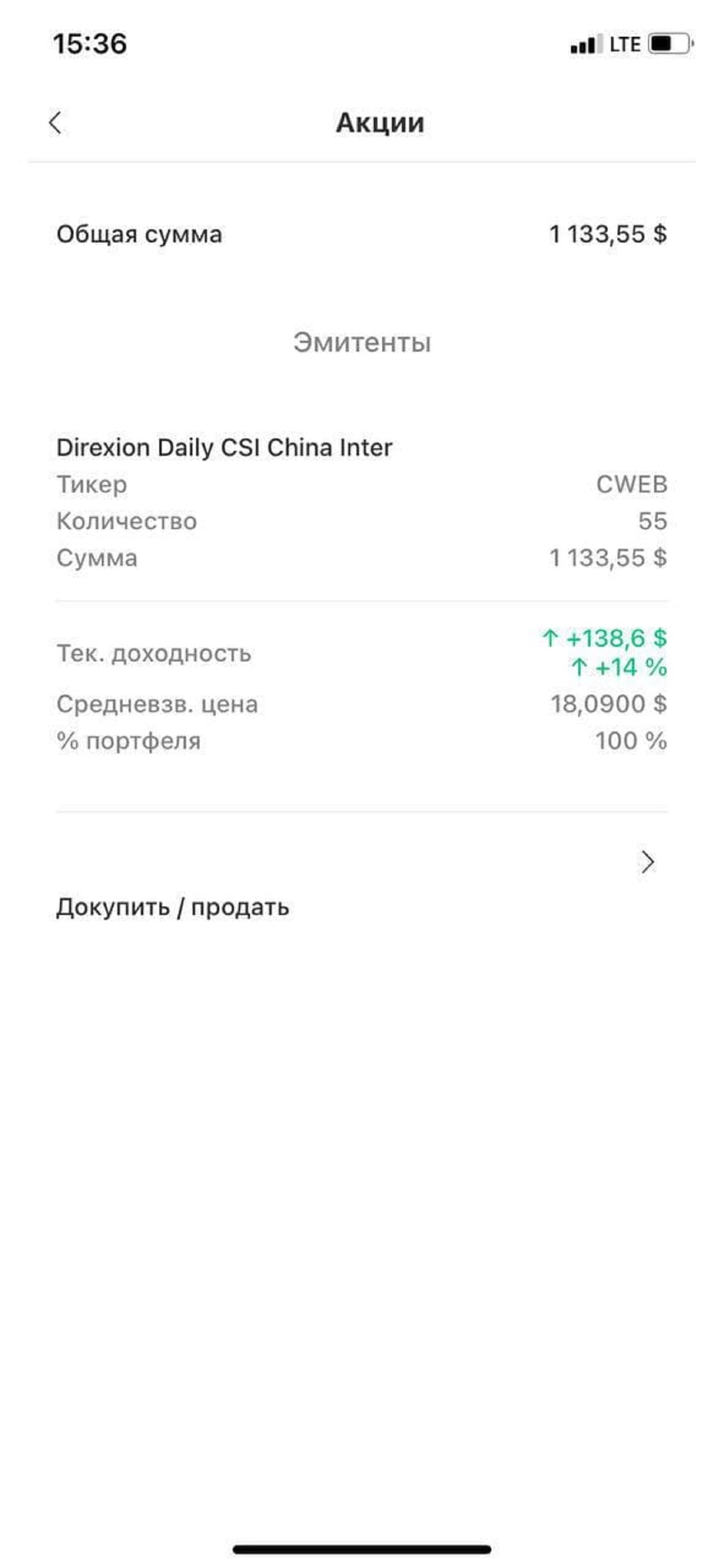 Так, на экране смартфона виден реальный инвестиционный портфель: общая сумма, количество ценных бумаг, их текущая цена, рост или падение. Рядом выход к активным операциям — кнопка «Докупить». Потому что это доверительное управление по приказу — тут клиент сам приобретает активы. А возможность наблюдать за процессом есть у всех клиентов со смартфона и через компьютер: