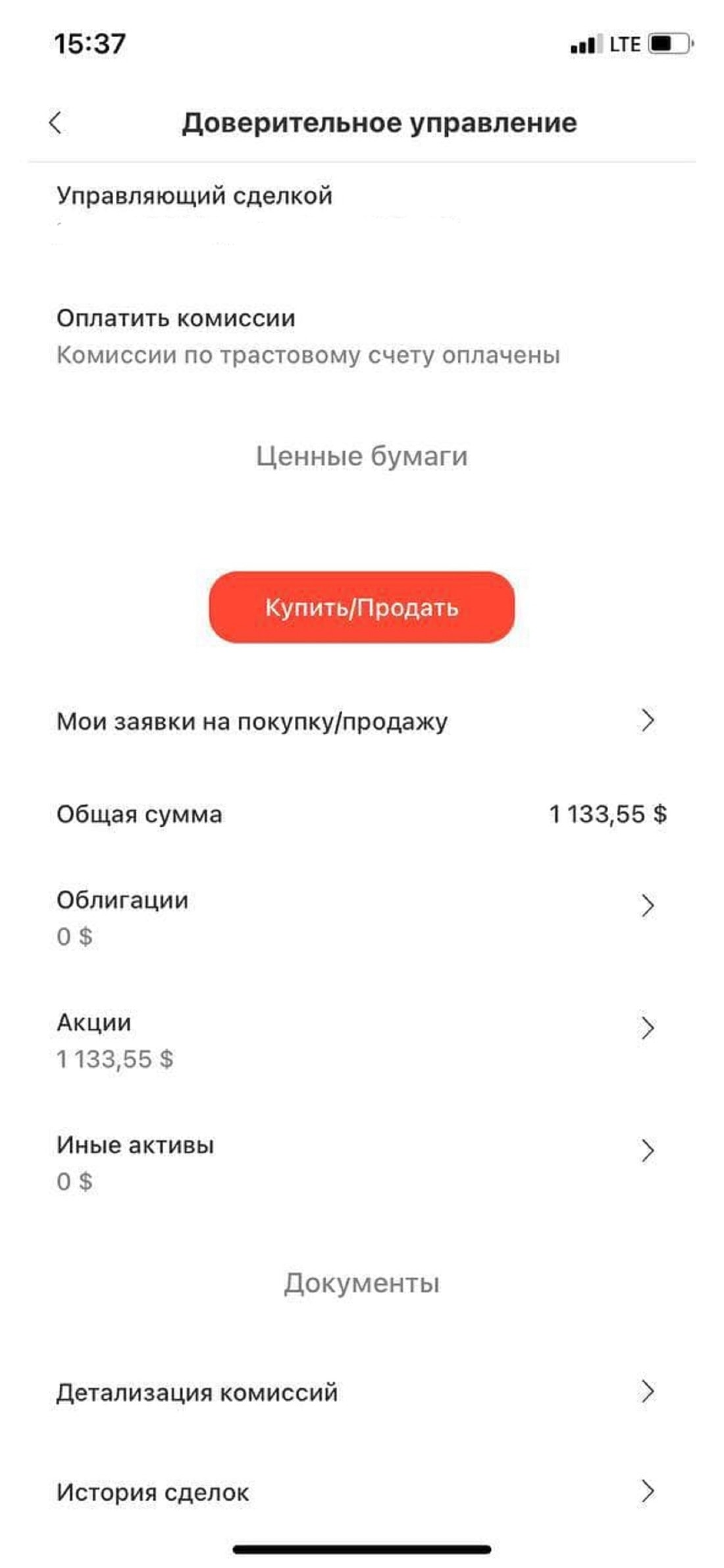 Теперь начинаем инвестировать. С полным доверительным управлением все более-менее ясно, но очень хочется проверить себя в качестве самостоятельного инвестора. Пропускаем моменты заключения договора, внесения денег, предварительного разбора программы и еще несколько этапов. Переходим к активным действиям в программе. Входим в соответствующий раздел со смартфона: