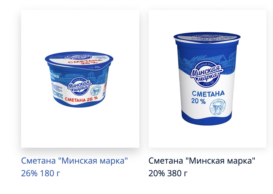 Сметана «Молочные горки», в отличие от прочих, радикально изменила цвет упаковки, став ярко-оранжевой. Поэтому покупатель явно заметит новый продукт, пусть и подорожавший. Раньше сметана имела жирность 25%, а теперь появилась жирность 22%, но дороже (6,58 и 6,83 рубля соответственно). Также у производителя появилась сметана 14-процентной жирности вдобавок к уже привычным 15% и творог жирностью 4%.
