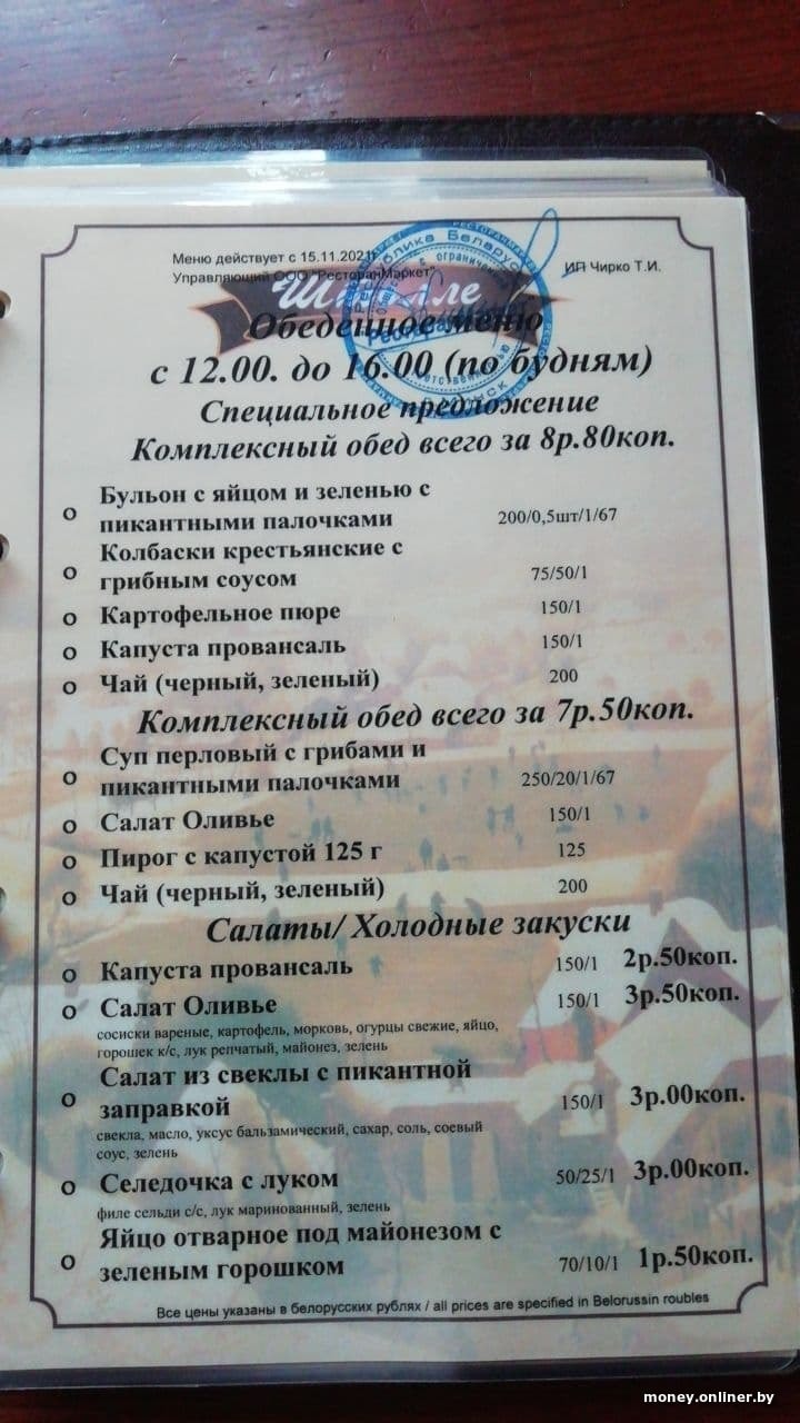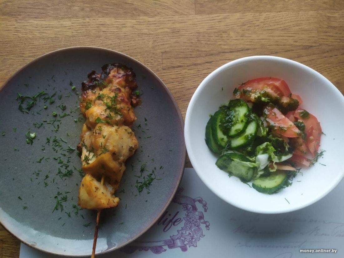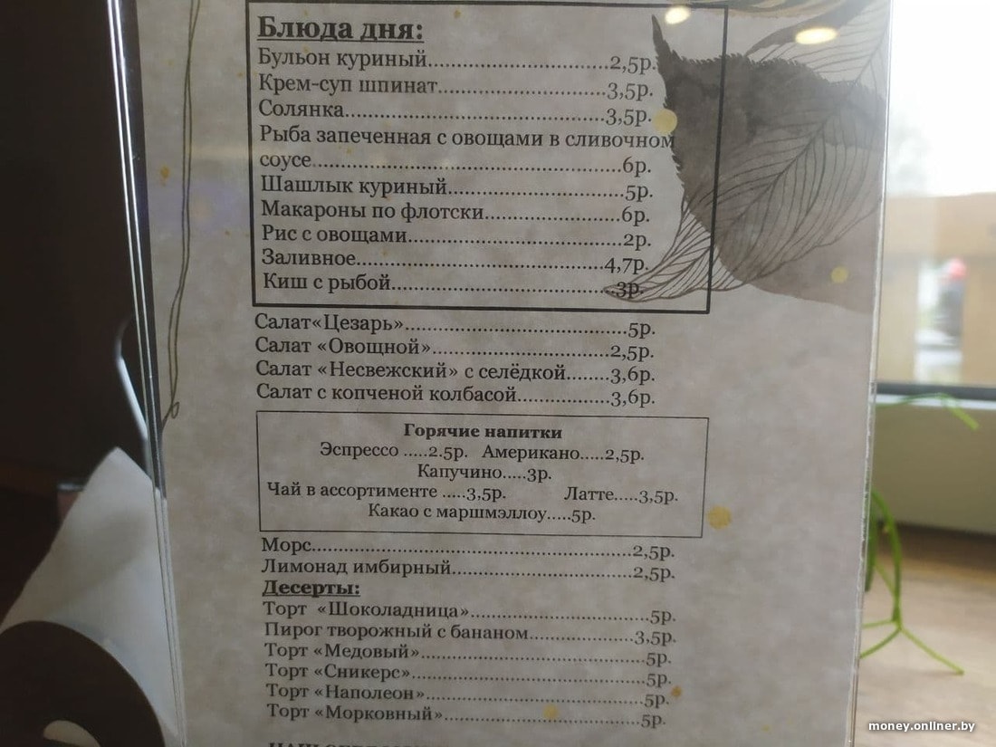 Сколько стоят обеды в минских кафе? В «Васильках» куриная котлета по-домашнему с картофельным пюре стоит 13 рублей 80 копеек. В «Штолле» можно пообедать за 8 рублей 80 копеек — вам принесут бульон с яйцом, колбаски с картофельным пюре, порцию капусты и чай. В «Кафе Гараж» хек с соусом карри и рисом в обед стоит 6 рублей 90 копеек. В «Пит STOP» кусочек отварного лосося весом в 100 грамм с большой порцией гречневой каши и отварной брокколи обойдутся вам в 18 рублей 17 копеек (красная рыба стоит больше 14 рублей). В кафе Amelie отдадите 7 рублей 50 копеек за куриный шашлык и весенний салат, добавьте рис — получится 9 рублей 50 копеек.