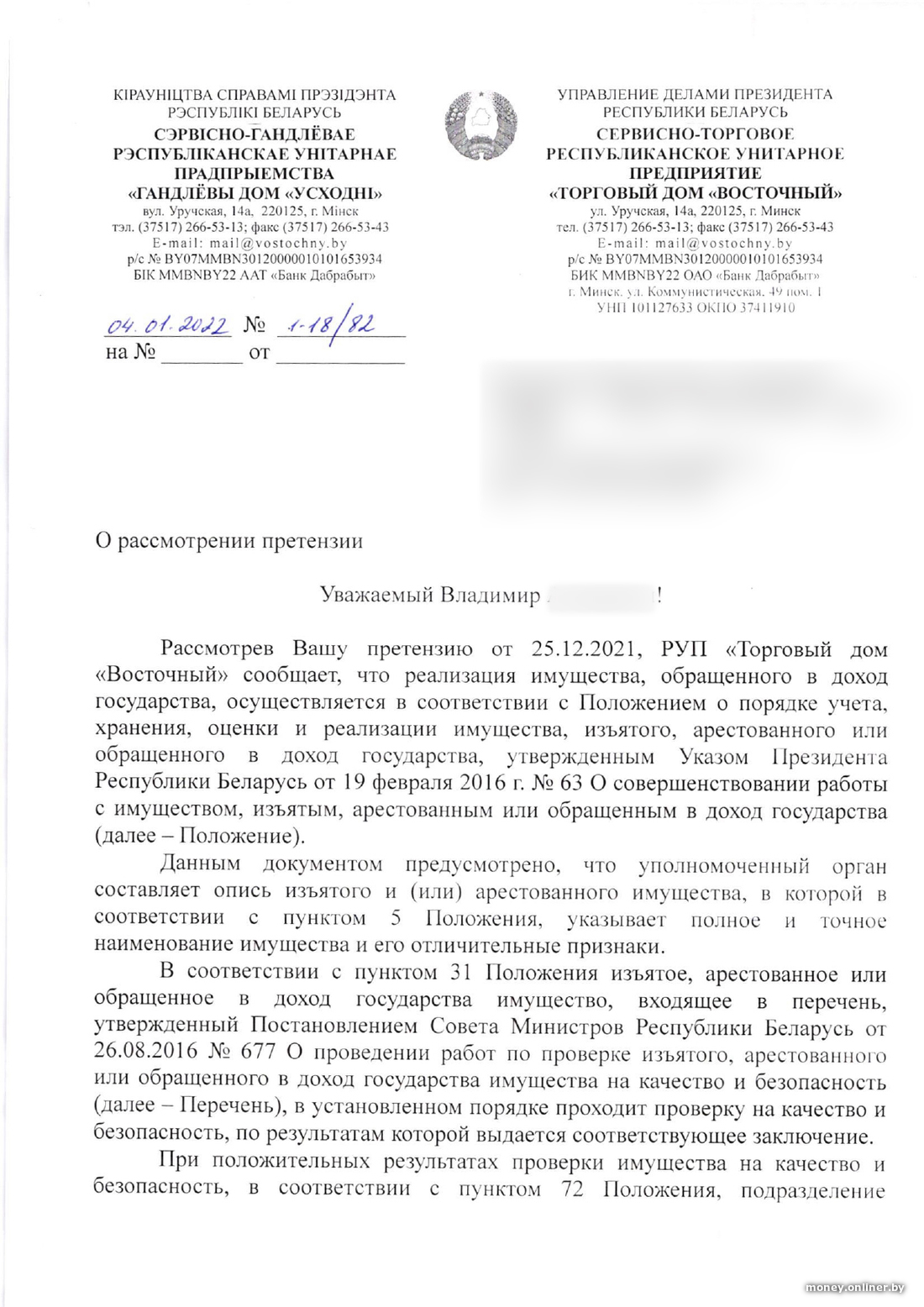 В ответе на претензию покупателя продавец разъясняет, как это работает. Есть Положение о порядке учета, хранения, оценки и реализации имущества, изъятого, арестованного или обращенного в доход государства. В соответствии с этим документом, «уполномоченный орган составляет опись изъятого и (или) арестованного имущества, в которой указывает полное наименование имущества и его отличительные признаки. <...> Изъятое, арестованное или обращенное в доход государства имущество <...> в установленном порядке проходит проверку на качество и безопасность, по результатам которой выдается соответствующее заключение».