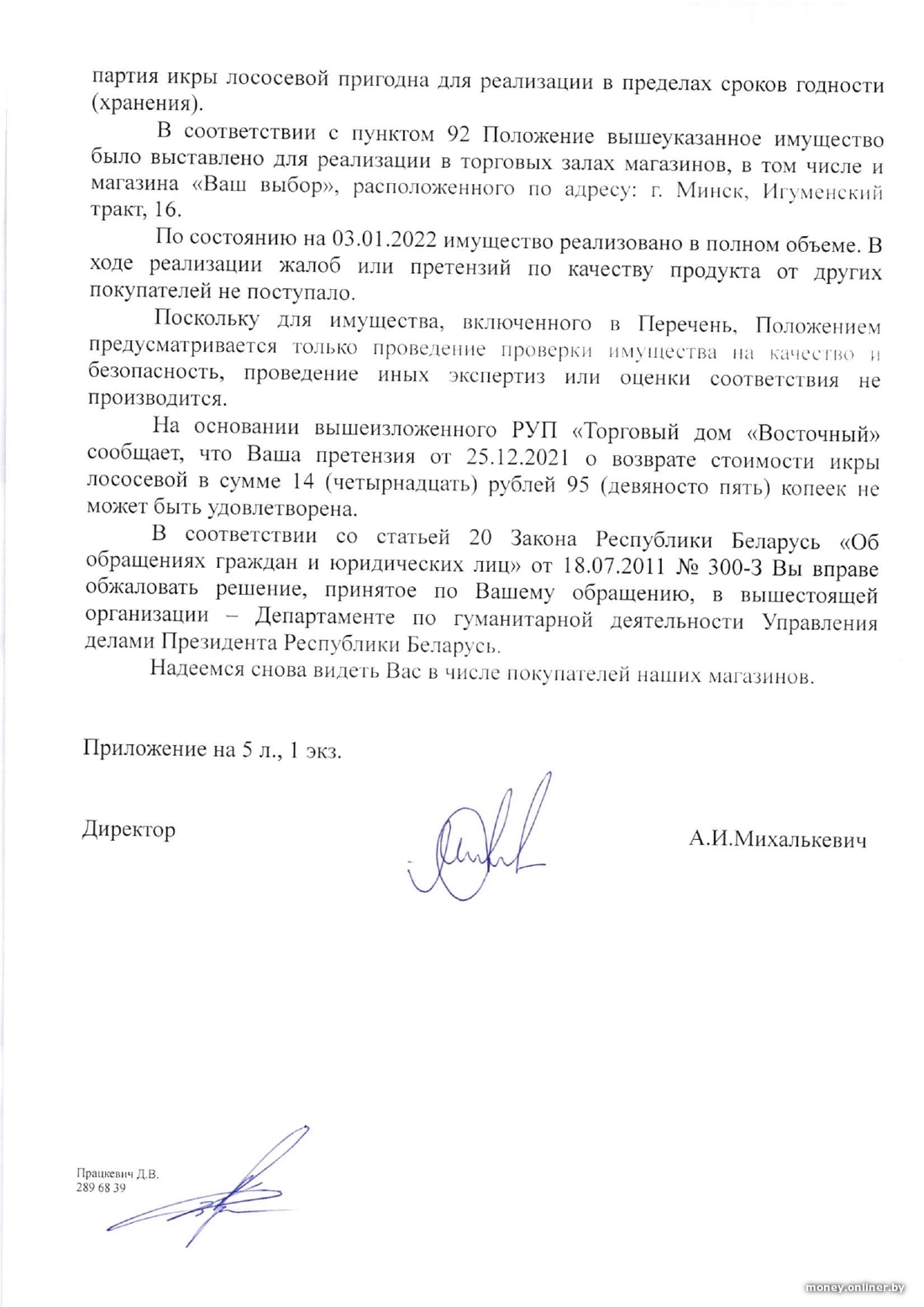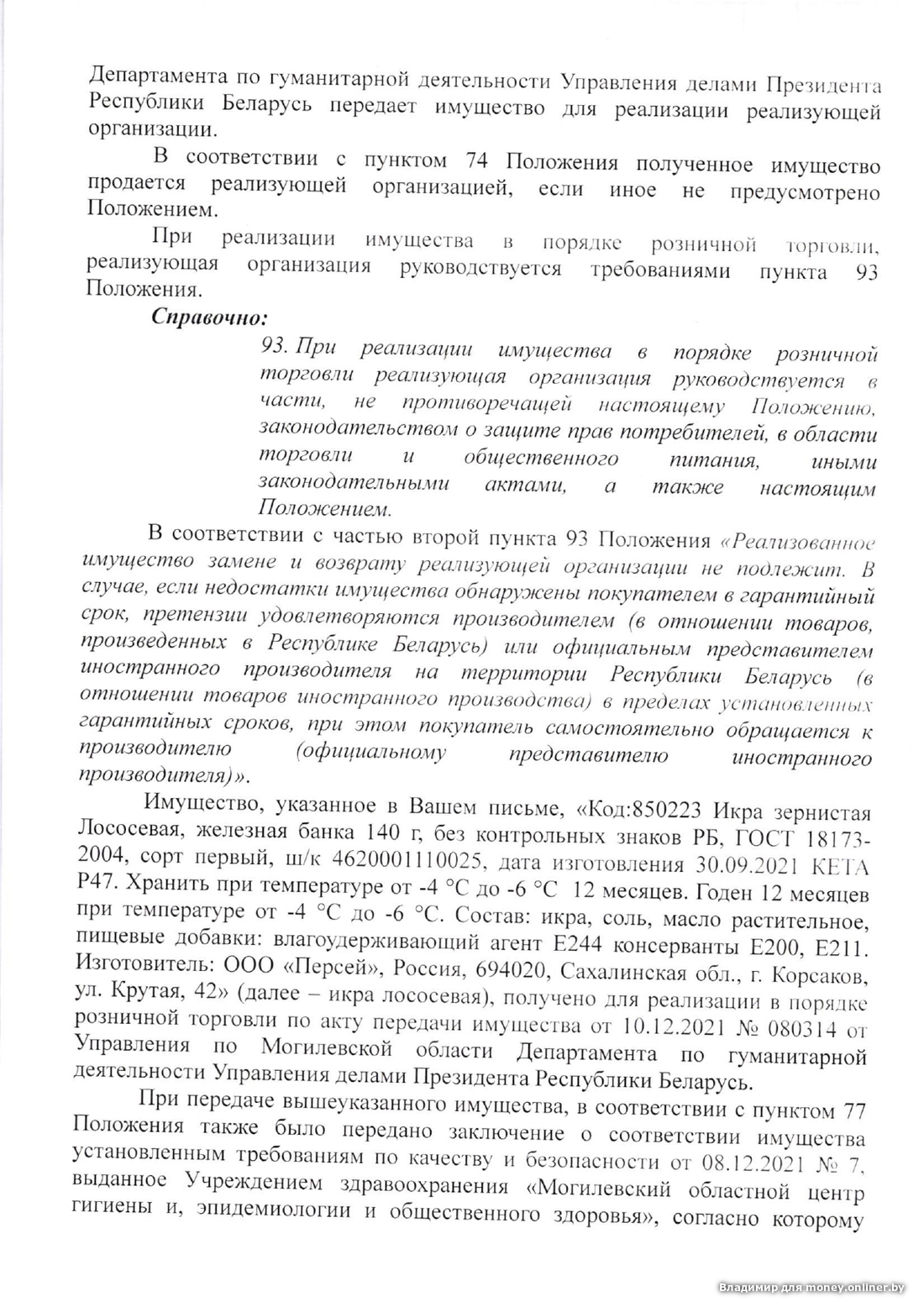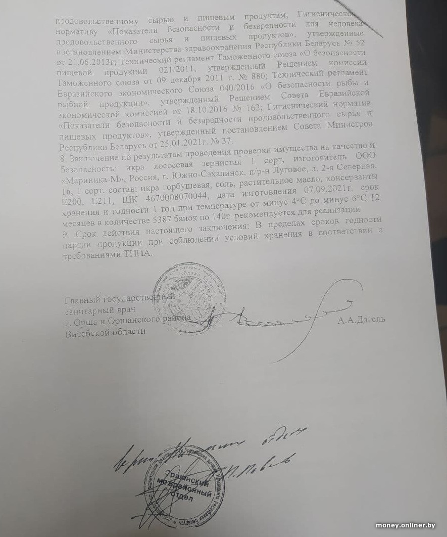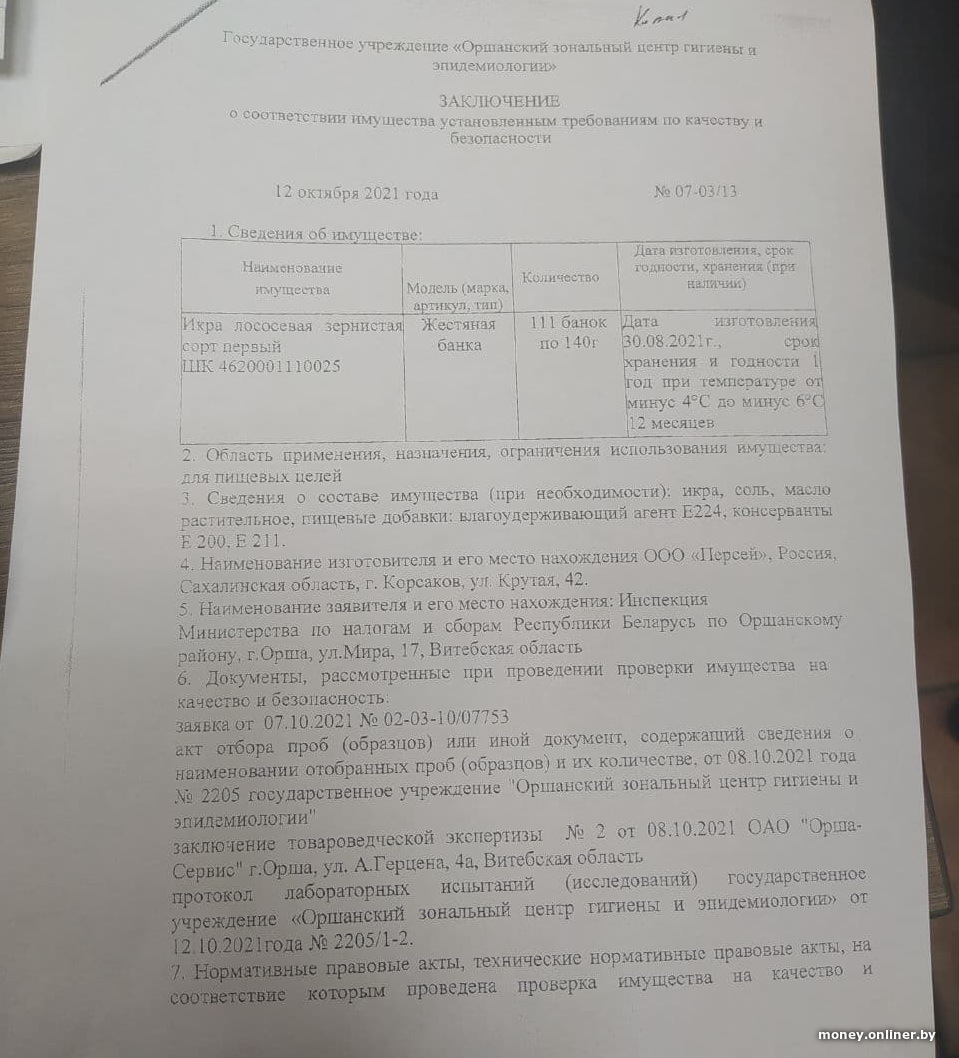 Проверку партии перед продажей проводил Могилевский областной центр гигиены, эпидемиологии и общественного здоровья. На его заключение и опирается продавец: «имущество соответствует установленным требованиям по качеству и безопасности», а «партия икры лососевой пригодна для реализации в пределах сроков годности» (на банке написано, что это 12 месяцев).