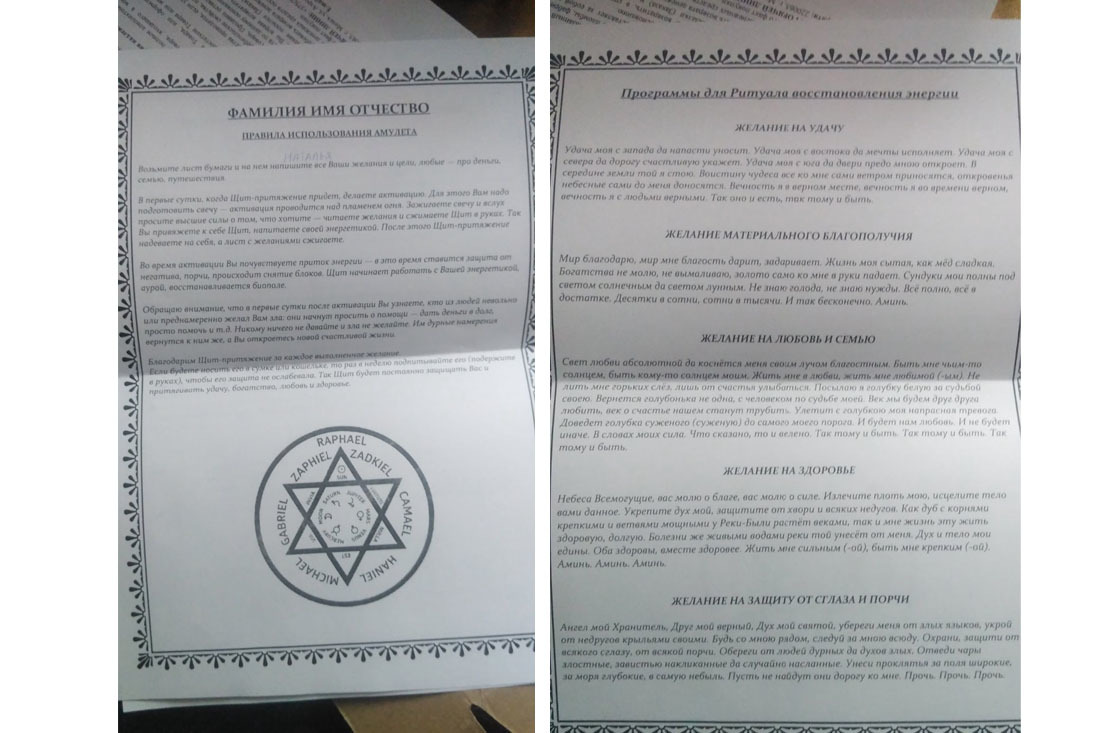 — Мама сказала, что менеджер по телефону сообщила: сам амулет будет стоить 26 руб. и еще 5 рублей за пересылку. В итоге пришла посылка на 265 рублей, почтальон принес ее прямо домой, когда там была только 84-летняя бабушка. У нее не спросили ни паспорта, ни других документов, сказали оплатить 265 рублей. Бабушка и оплатила. Мама как узнала, сразу села на успокоительные, потому что у нее зарплата в колхозе 300 рублей. Что это был за сайт, она вспомнить не могла.