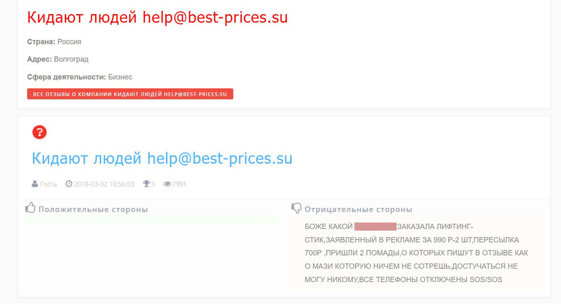 Указанный в письме и на конверте адрес Аэродромная, 7 принадлежит минскому почтовому отделению. В качестве и-мейла указано кое-что интересное: адрес help@best-prices.su. Если вы введете эту почту в поисковике, то увидите старые, но проясняющие ситуацию отзывы. Это отзывы покупателей из России — речь явно идет о российских магазинах. При чем тут белорусская ипэшница? Позже мы узнали ответ и на этот вопрос.