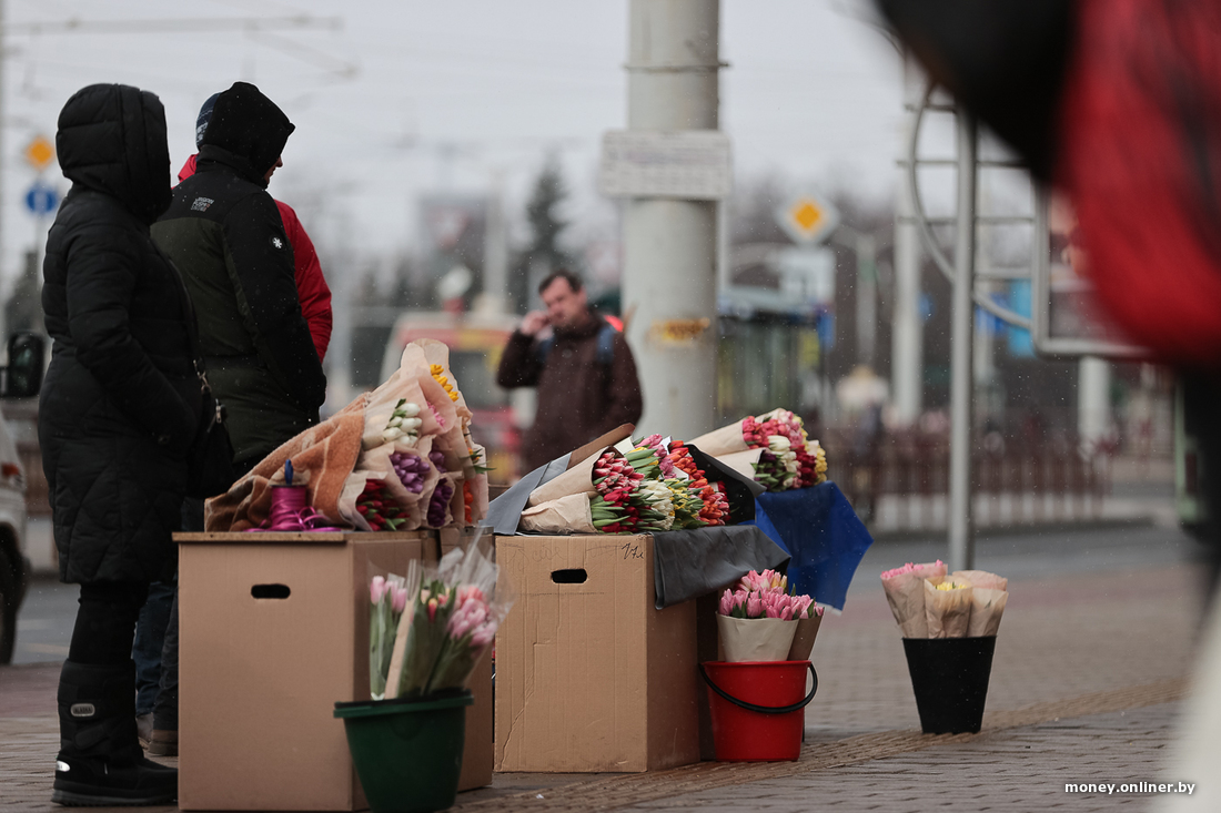 Анна, которая продает тюльпаны по соседству (и мимозы по 2—4 рубля), соглашается: в этом году спрос не такой.