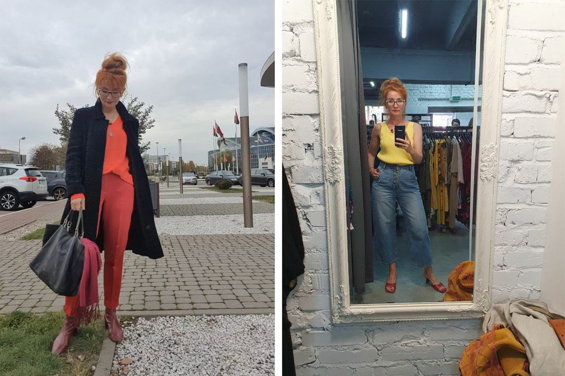 Инна — профессиональный стилист, любит выбирать для себя одежду в секонд-хенде. Говорит, что секонд-хенд вполне могут носить те, кто привык к люксовой одежде — например, для одной из своих клиенток, которая обычно носит Chanel и Valentino (назовите секонд-хенд словом «винтаж» — и это прозвучит богато), Инна подобрала в секонд-хенде бархатный пиджак. В качестве подтверждения, что на барахолке можно одеться хорошо, Инна выслала свои фото. Вся одежда на женщине из секонд-хендов.