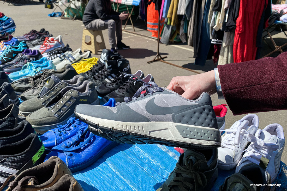 Обувь совсем разная, в том числе по серьезным ценам. Беру Nike и спрашиваю у продавца цену, слышу ответ: «Эти за 120». Пару недель назад здесь же, на Ждановичах, на торговых рядах мы видели новые кроссовки за 70 рублей, тоже с надписью Nike. Продавец видит мое удивление и предлагает самые дешевые — за 40 рублей. Обувь поношенная — на это указывает подошва, зато похожа на оригинал и выглядит более-менее аккуратно, мои кроссовки обычно так выглядят уже через неделю после покупки, как эти серые.