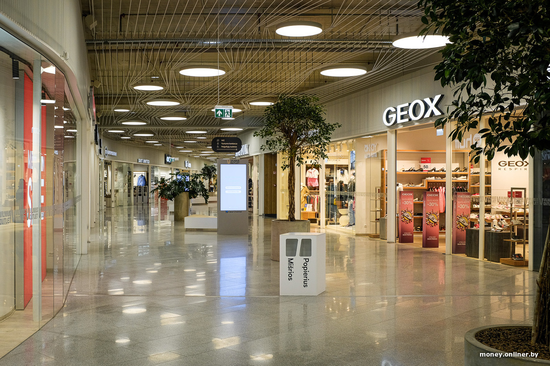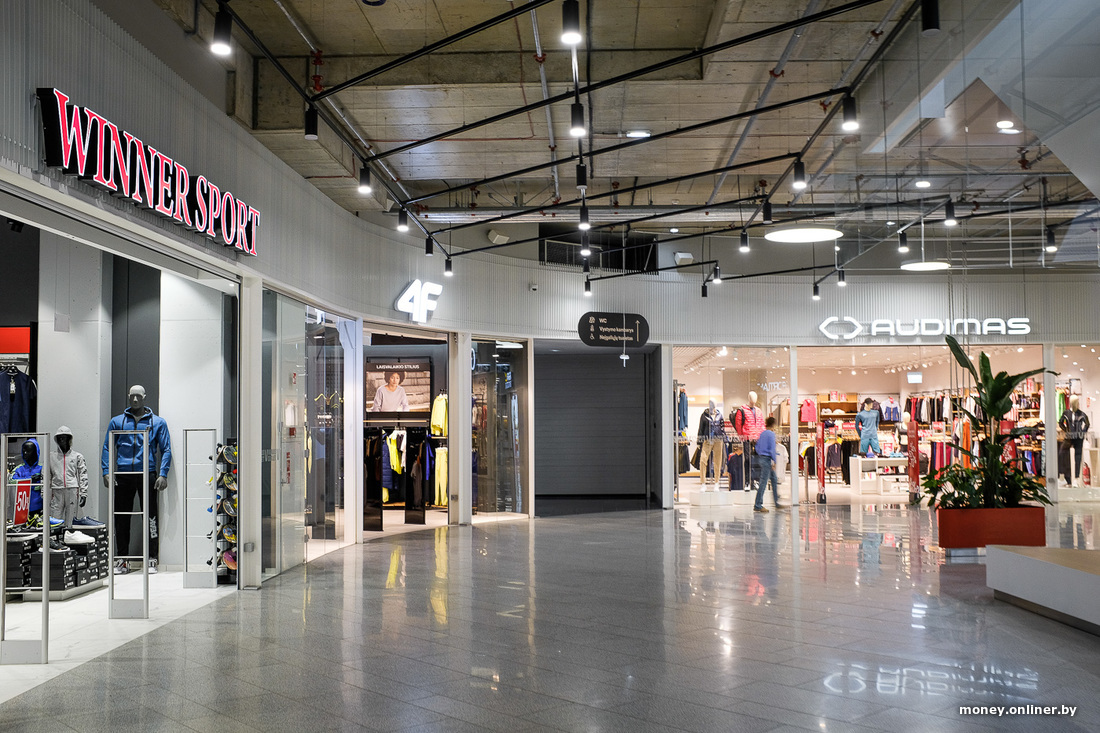 Внутри — сплошные плавные линии от пола до потолка. Зацикленным на упорядоченности людям будет очень удобно пройтись по одному-единственному маршруту — сделав круг на втором этаже. Здесь сконцентрированы все магазины. При открытии говорили, что товарами и услугами будут торговать 150 компаний. Это много, но монобрендовых магазинов с известными белорусу названиями наберется 1—2 десятка. В основном это мультибрендовые стоки. Больше всего — обуви и спорта.