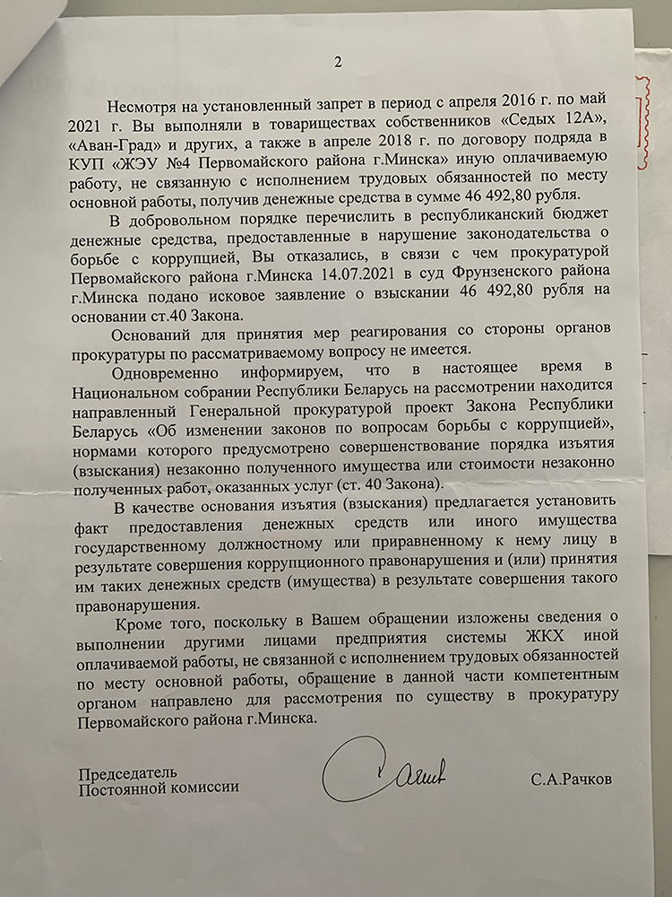— Мне никто не может объяснить, чем я навредила совмещением и какие интересы госбезопасности я подставила? Я не находила работу благодаря ЖЭУ, не принимала никаких решений и никак не задевала общественные (государственные) интересы. Я даже «плюшек» никаких не получала от своего госстатуса — ни значимости, ни пенсии, ничего — только очень спорных размеров зарплату. Это не министерство, не исполком — это обычное ЖЭУ!