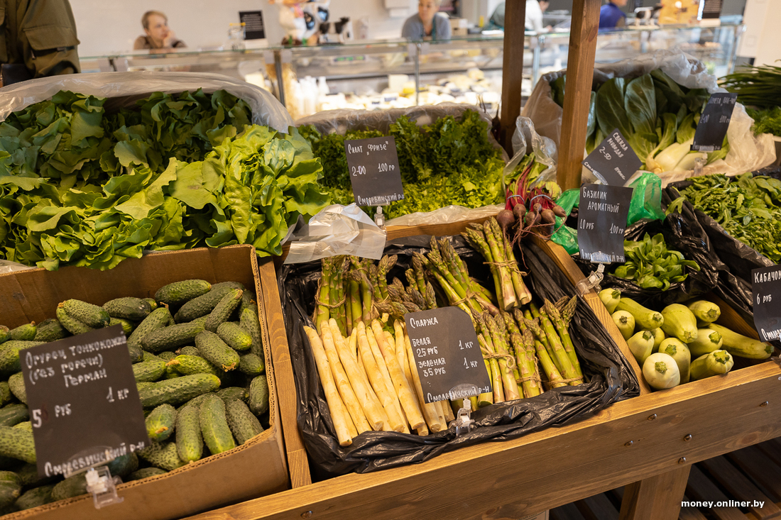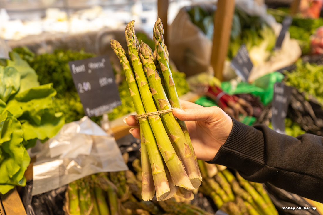 Белорусских овощей на рынке пока мало: немного огурцов, кабачки, редиска, лук, мелкая свекла, морковка, прошлогодняя тыква. Пока не впечатляет. Зато есть белорусская спаржа и несколько видов салата. Эта точка — единственная на рынке с небольшой толпой покупателей в пятницу утром, пообщаться с продавцом мы так и не смогли, хотя подходили четыре раза.
