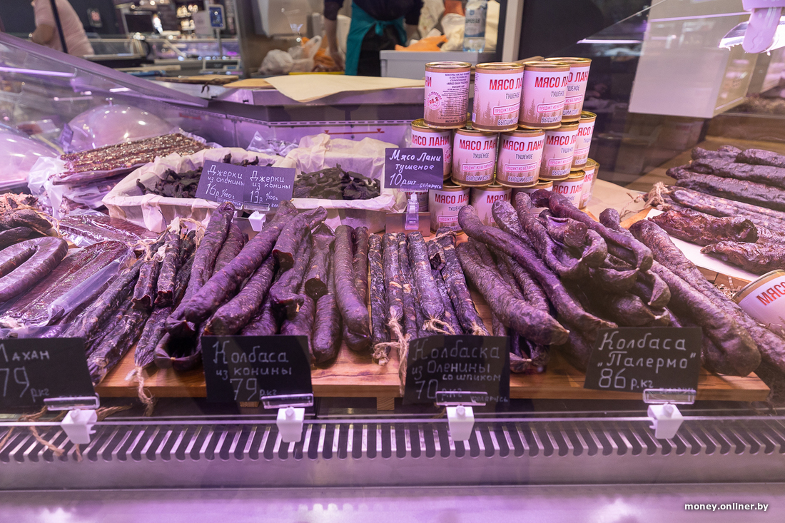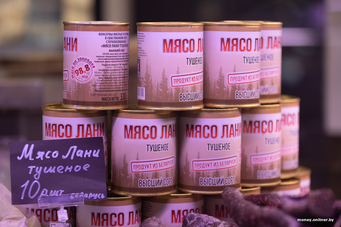 У нас свежая оленина, лань, лосятина иногда бывает. Мясо лося похоже на телятину, мы продаем нежную, молодую. Раньше было как: подстрелил отец лося, мясо вымачивают два дня, забивают холодильник на несколько недель. У нас по-другому. У нас есть тушеная консервированная лань, ее приготовил пищевой комбинат в Молодечно для нас из нашего сырья.