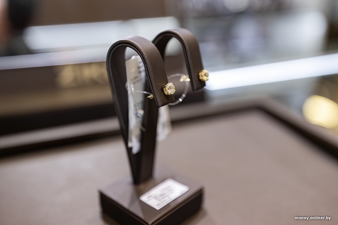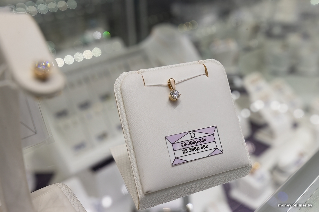 — У нас есть «каратное» кольцо почти за 57 тыс. рублей, в нем «каратник» (камень на 1 карат. — Прим. Onlíner). Есть люди, для которых важно, чтобы в изделии был именно «каратник», это хороший большой камень. Это вы у нас раньше не были, у нас и за 94 тыс. были серьги, — сказали нам в Diamante. — Есть в наличии сережки с бриллиантами почти за 57 тыс., подвеска за 23 тыс.