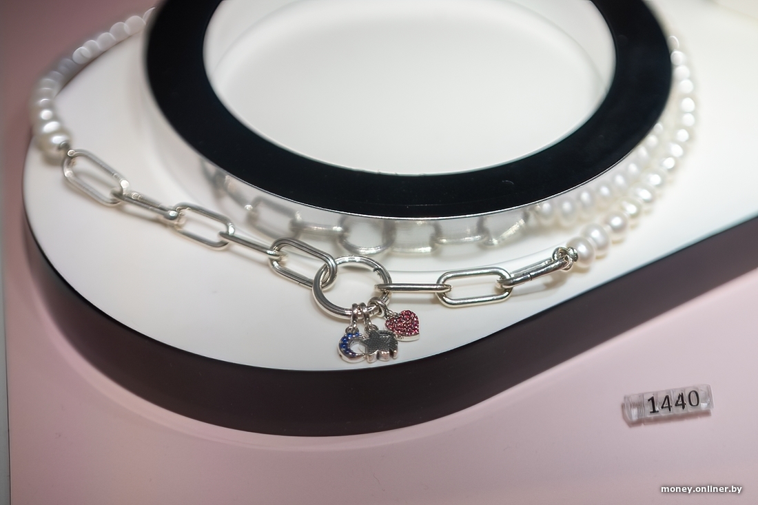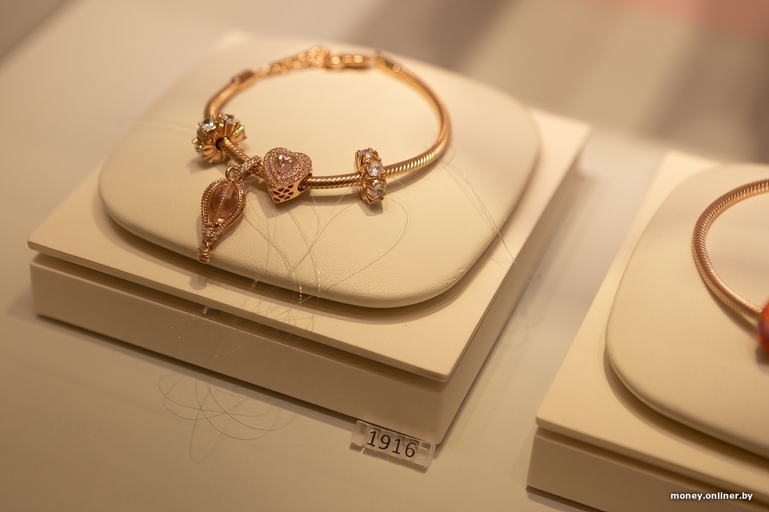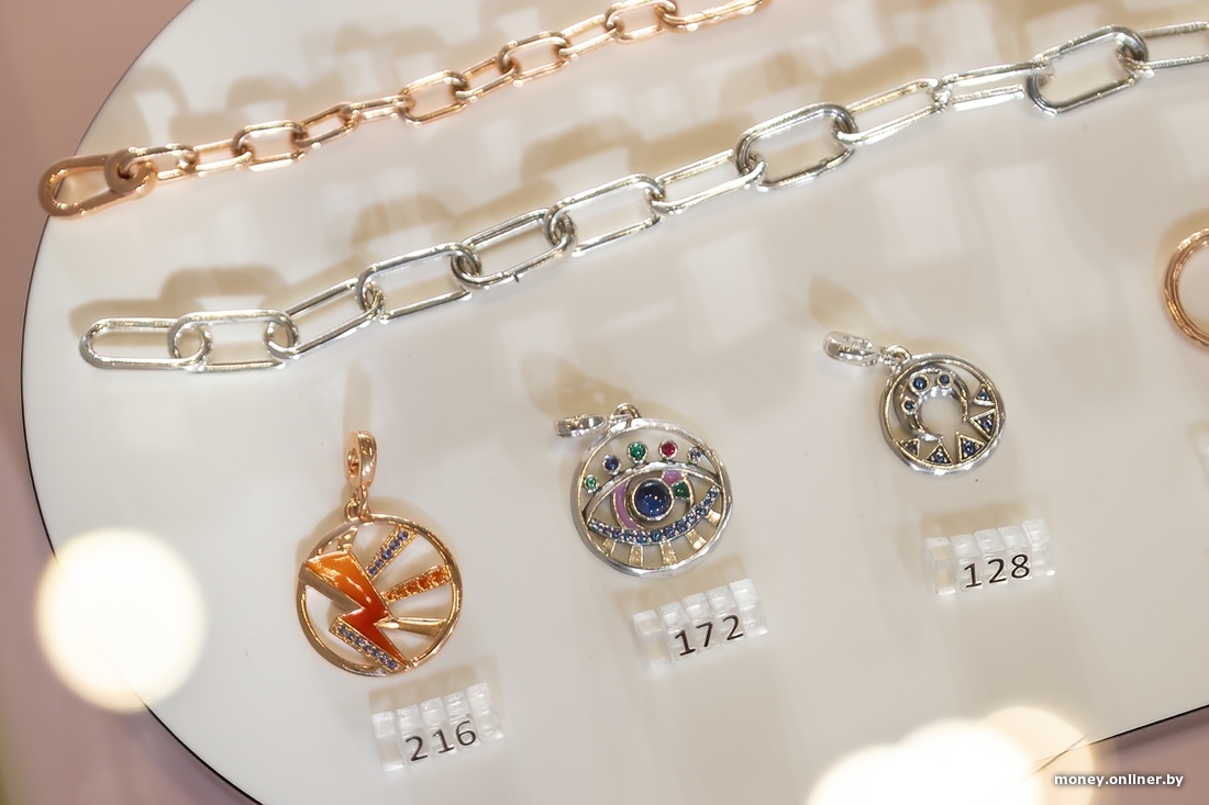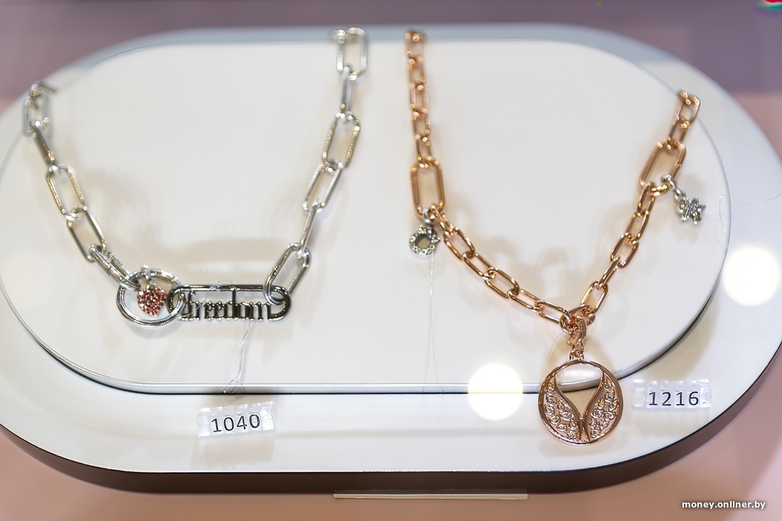 Продавец Ольга указывает на браслет из серебра, покрытый розовым золотом. На браслете четыре шарма со вставками из кубического циркония (то есть с фианитами, искусственными кристаллами). Это самое дорогое украшение в магазине, которое сейчас есть в наличии, цена — почти 2 тыс. рублей, то есть примерно полторы зарплаты среднего белоруса.