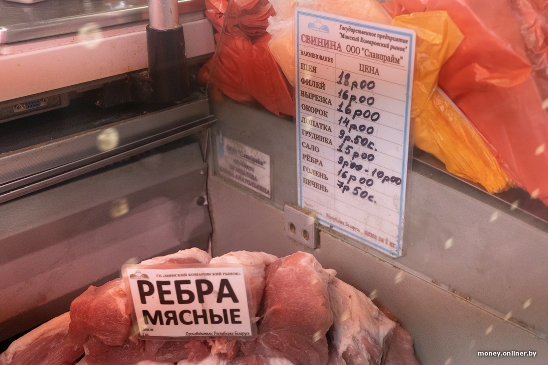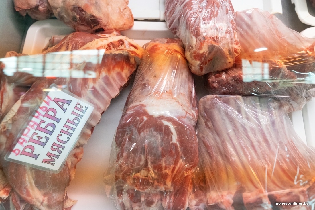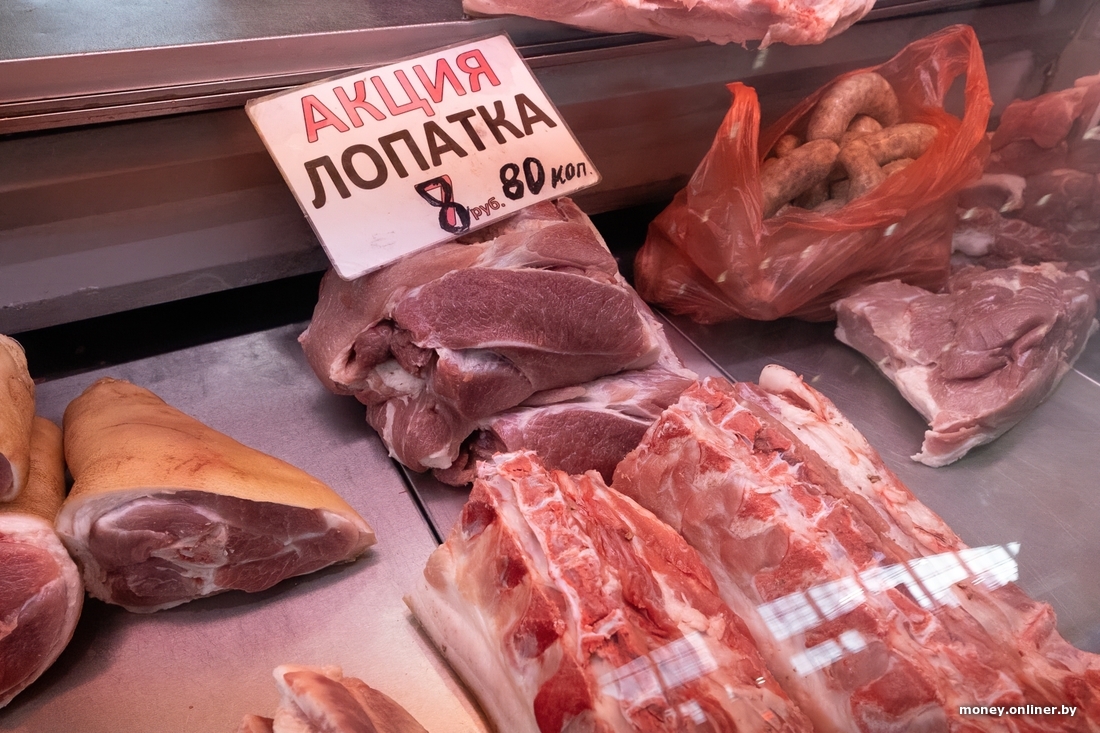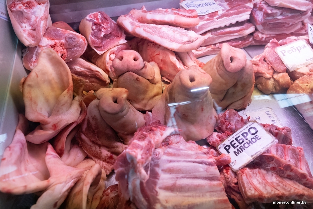 Свинину (лопатка) продают по 8,8 рубля за килограмм (по акции), телятину — по 30, куриную тушку по 18. Свиная голова — 4 рубля за килограмм, зато рыло можно получить за 2 рубля.