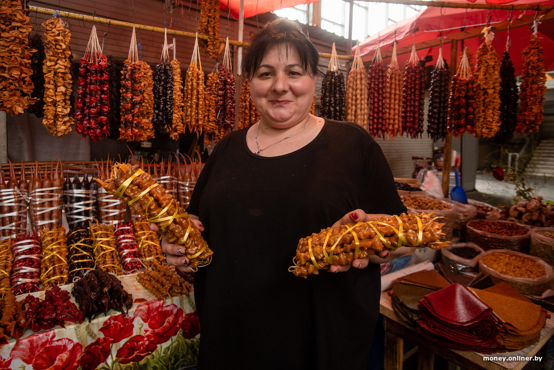 Оставляя самое вкусное и манящее на потом, сначала заходим в одну из крытых частей рынка, где продаются специи, приправы, орехи, сухофрукты и, конечно же, грузинский бренд — чурчхела. Нас приветливо встречают две продавщицы в расцвете лет. Радуются, услышав, что мы из Беларуси. Стесняются фотографироваться: говорят, поднабрали лишний вес и будут готовы, когда похудеют. Позже понимают, что вряд ли кто-то из сограждан увидит их портреты, и соглашаются.