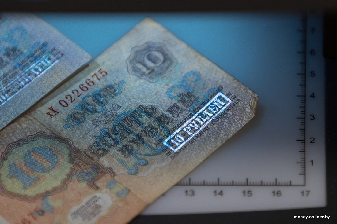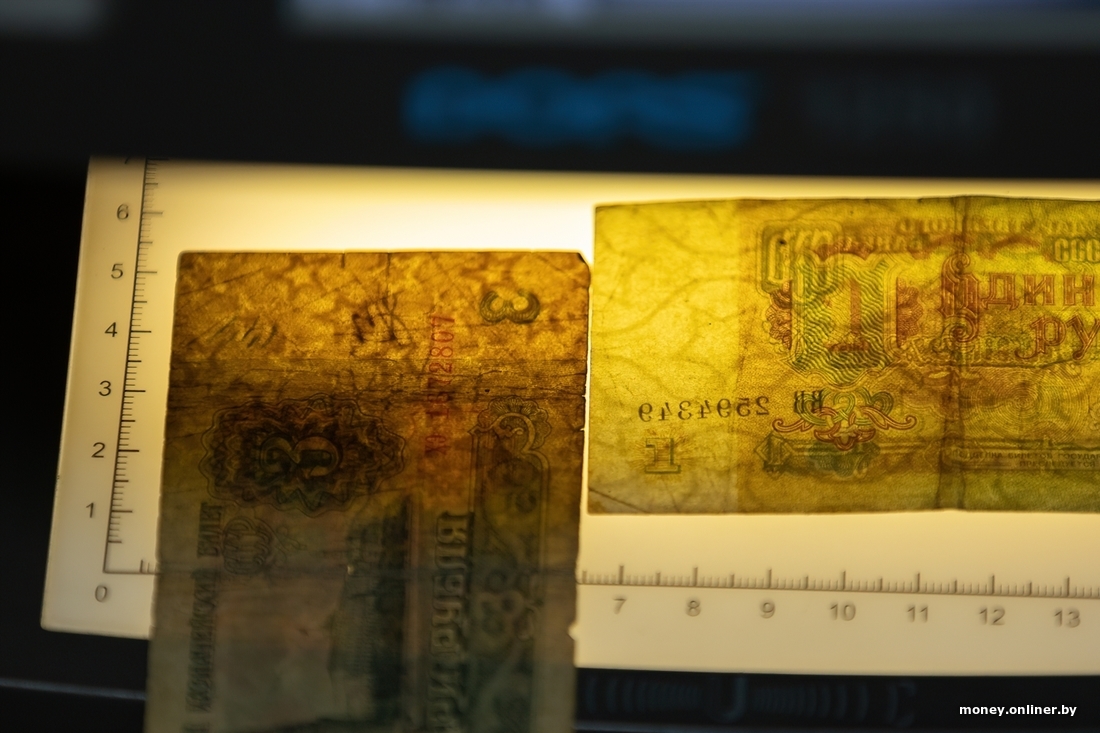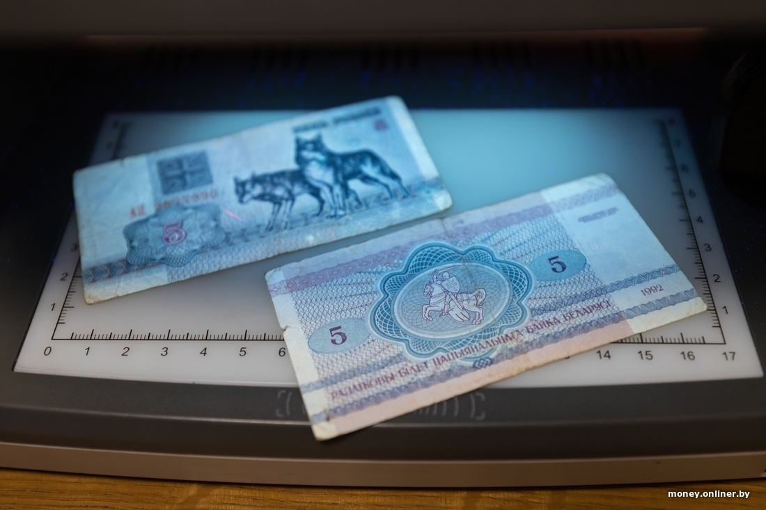 — Сама купюра в нормальном состоянии, естественного износа нет, видно, что с ней обращались мало. Но видите светящиеся пятна? К сожалению владельца, ими покрыта слишком большая площадь купюры, — говорит Жанна Кондратович. — Я не химик, не знаю, что стало причиной их появления. Может, грязными руками брали, может, мыльными. Факт в том, что эту купюру вы, скорее всего, сдадите только на инкассо (обмен на другие купюры в банке за процент. — Прим. Onlíner). Или пробуйте рассчитаться в Европе: это местная валюта, должны заменить.