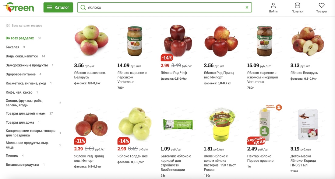 На сайте «Е-доставки» самые дешевые яблоки — польские: красные яблоки из Польши на 32 копейки дешевле (по 2,54 рубля за 1 килограмм), чем белорусские (они по 2,86 рубля). В доставке продуктов от магазинов Green белорусские яблоки и вовсе дороже 3 рублей — по 3,13 и 3,56, при том что импортные яблоки, пусть и на скидке, стоят от 2,39 рубля.