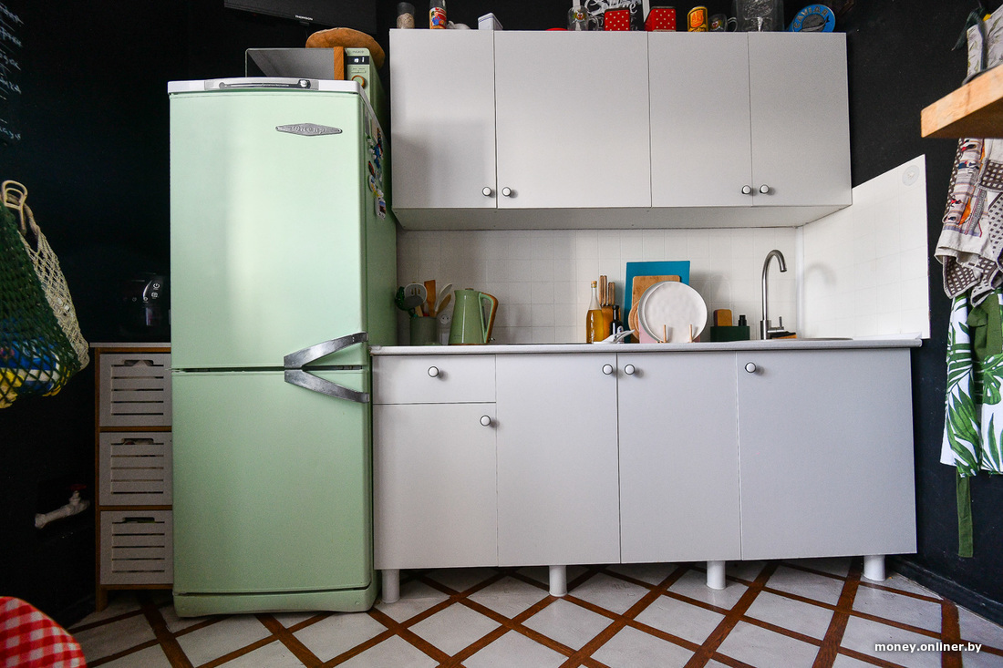 На место старого буфета ребята установили самый дешевый гарнитур, а дальше уже начали проявлять фантазию. Холодильник, который бесплатно достался от сестры, покрасили баллончиком и прилепили к нему значок «Днепр». Микроволновку и чайник купили новые, но тоже в ретростиле.