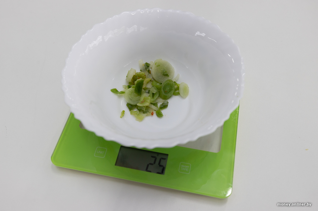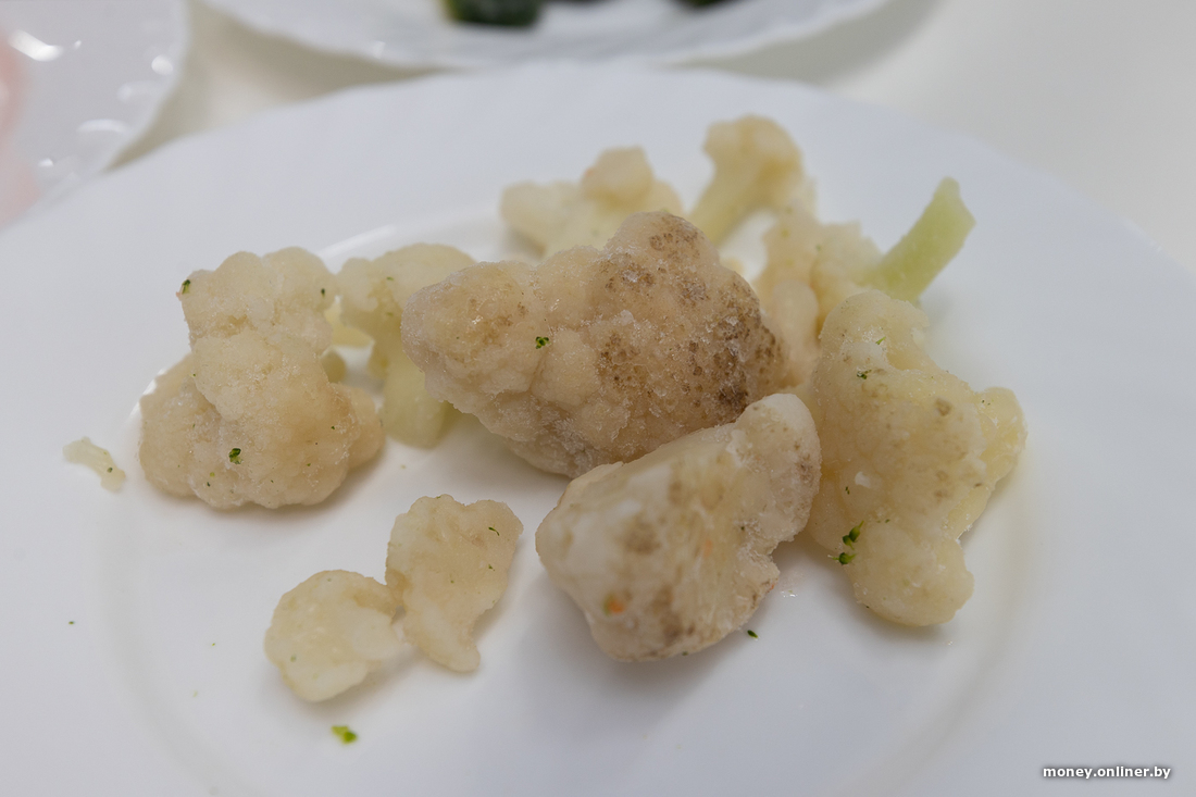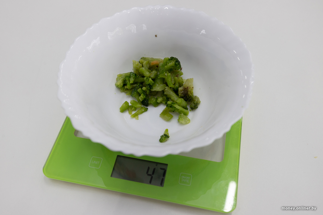Вот какое соотношение мы нашли в пачке весенней смеси: 128 граммов брокколи, 135 граммов цветной капусты и 127 граммов моркови — в сумме 390 граммов (будем считать, что просто подтаяло немного воды) за 5,39 рубля.