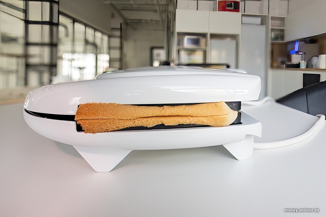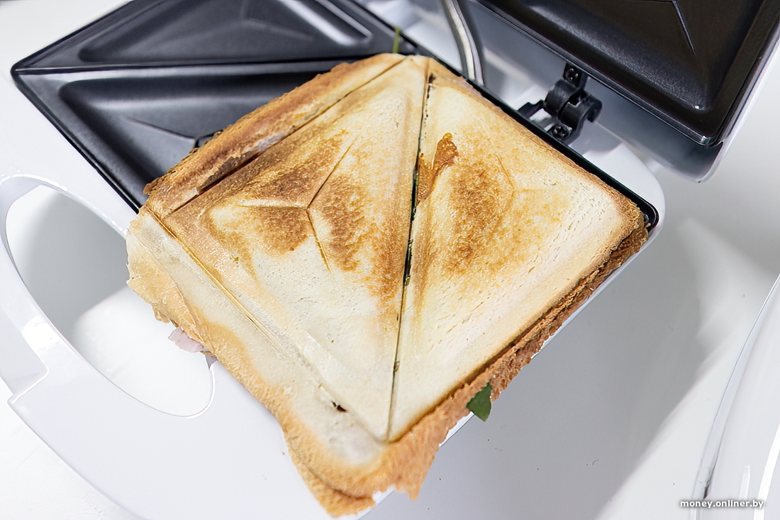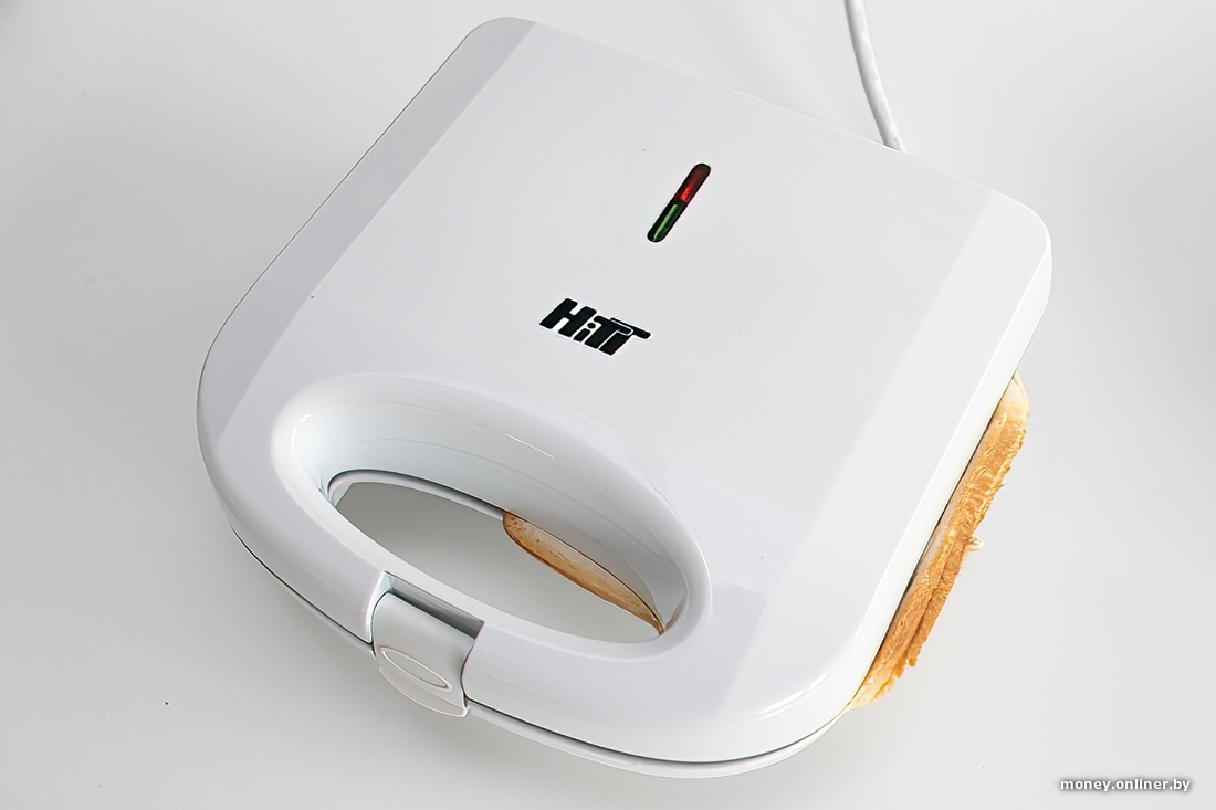 Этот сэндвич для нас готовила бутербродница HiTT. Не самая мощная, в описании указана разбежка в 680—790 ватт. Вряд ли она подойдет для кафе, где горячие сэндвичи готовят на потоке. Для дома — вполне себе, имеет все характеристики бюджетных аналогов (плитки с антипригарным покрытием, индикатор готовности), еще и занимает мало места — ее можно хранить в вертикальном положении.