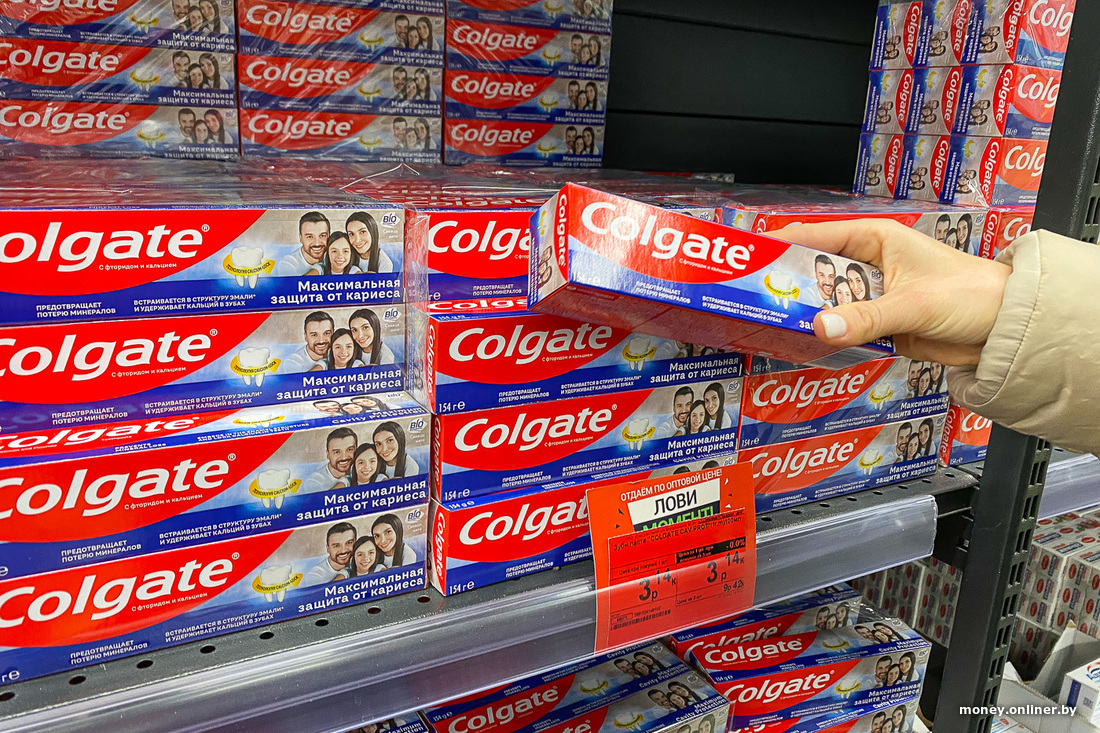 И куда же без стирального порошка и зубной пасты. Мы нашли огромную банку средства для стирки Lexa — 11 килограммов. Выглядит мощно, как банка краски, и совсем недорого. Но мы удержались от покупки, потому что для оптовой цены надо купить две штуки.