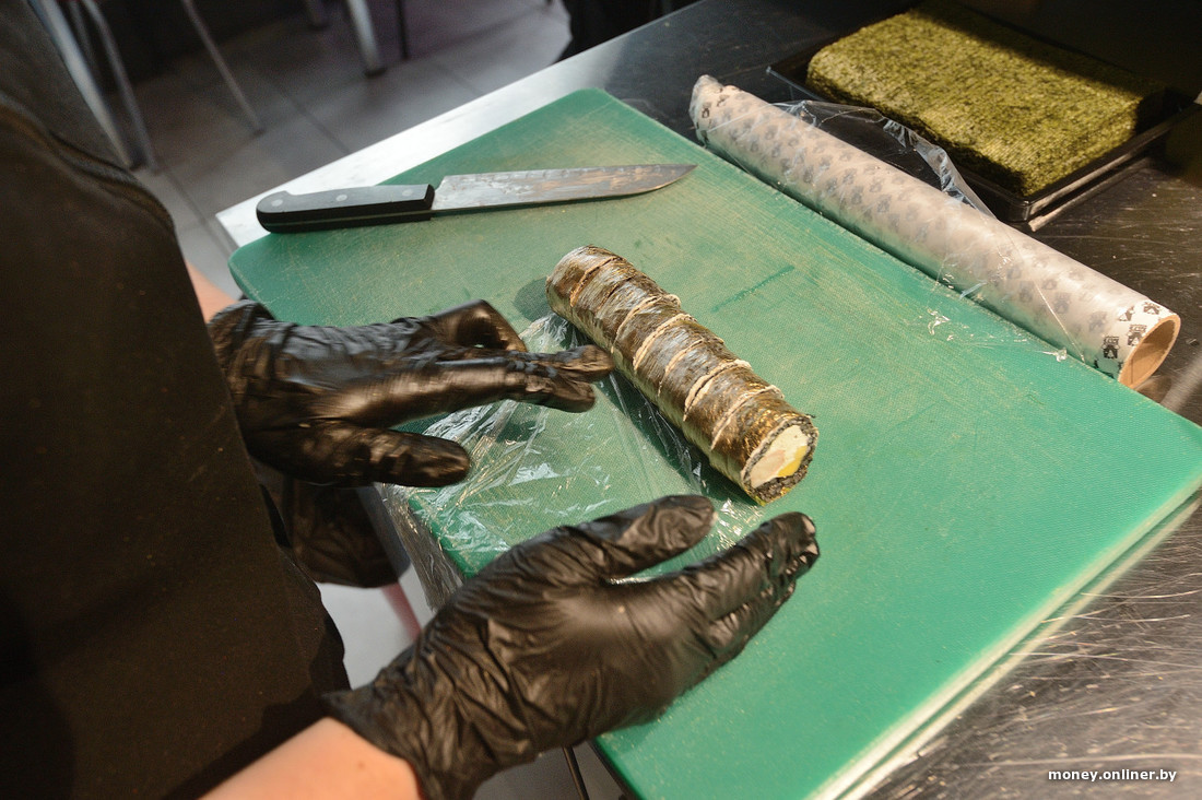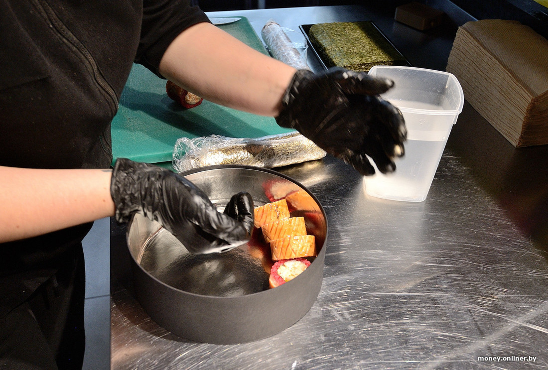 Как и положено доставке премиум-суши, находится она в модном районе — «Маяк Минска». Идем на кухню в ожидании увидеть суету, характерную для общепита. Но утром буднего дня обстановка оказалась более чем спокойной: у повара не было ни одного заказа. Для сегмента премиум — это нормально, убежден владелец сушерии Максим Свиридов.
