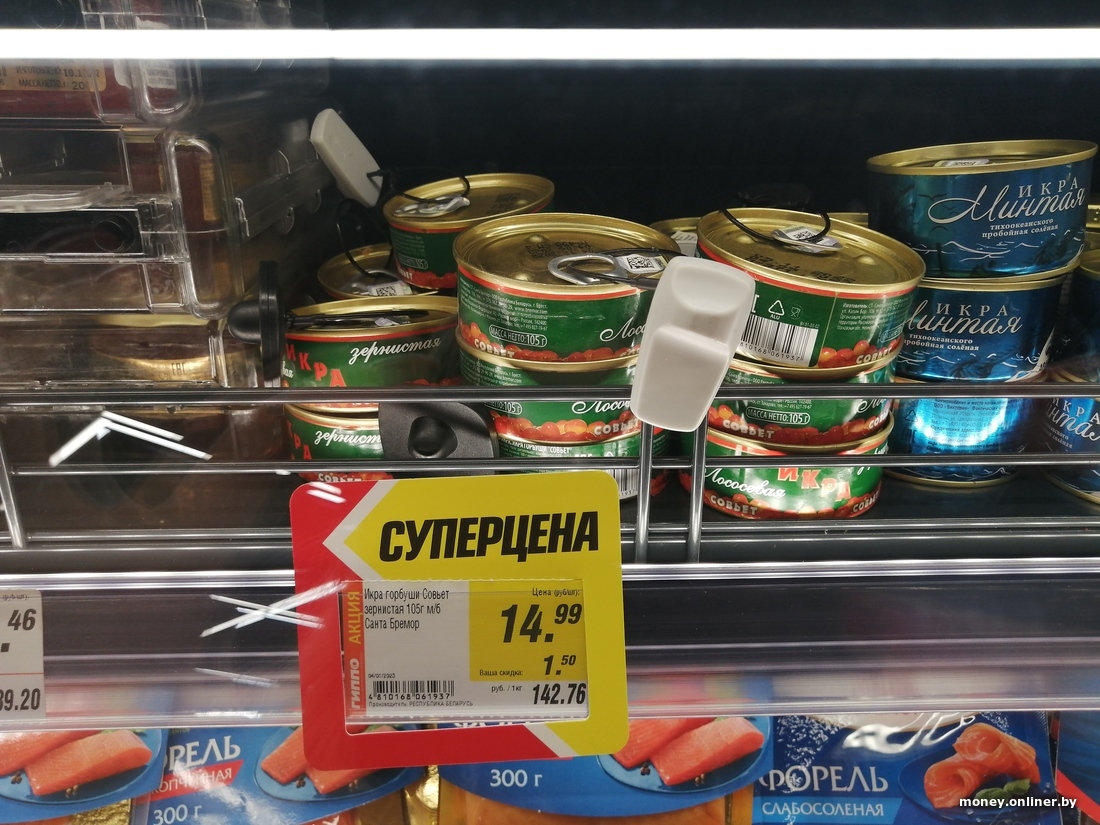 А что по продуктам? Тут мы тоже не обнаружили существенной экономии по сравнению с концом прошлого года. Мандарины как стоили 6,49 рубля, так и стоят. Красная икра «Совьет» и неделей раньше продавалась по «суперцене» — 14,99 рубля. Охлажденный стейк лосося можно было купить за 55,99 рубля — сейчас тоже ничего не изменилось. Горошек нежный Bonduelle по-прежнему продается по 4,19 рубля за банку, хотя спрос на него, очевидно, в разы меньше.