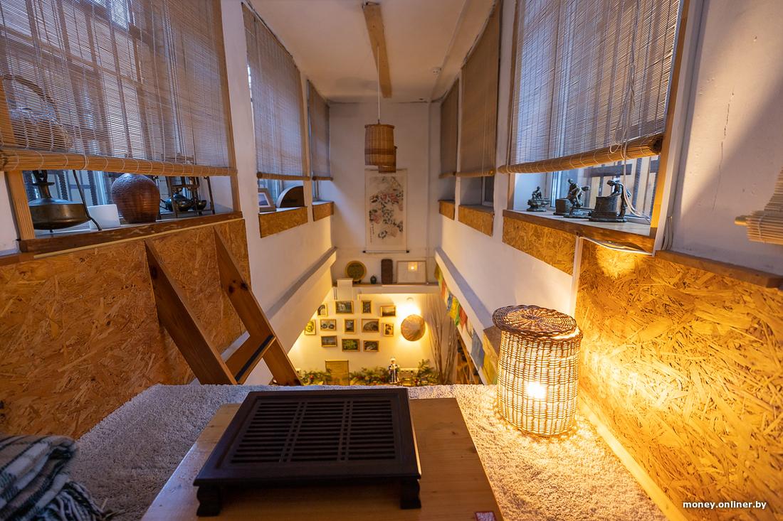 Спускаемся в подвал, из которого можно попасть на чердак (да, вы не ошиблись). Дело в том, что чайное королевство многоуровневое, здесь три этажа. Вдоль лестницы стоят десятки 20-литровых бутылок с водой. Грузчики, видимо, проклинают это место, ведь в неделю тут осушают 20—30 таких тяжеленных бутылок. Если переводить на чай, за неделю посетители выпивают около полутонны любимого напитка.