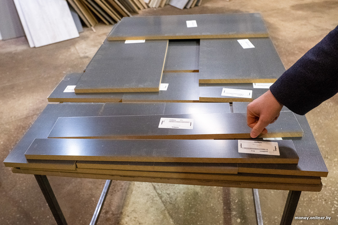 Готовые 3D-модели загружаются в станки, распил производится на станке ЧПУ по картам раскроя. На каждую распиленную деталь наклеивается стикер со штрихкодом, по которому присадочный станок определяет, где сверлить отверстия. На каждом участке установлен компьютер, и менеджеры видят, на каком этапе находится заказ.