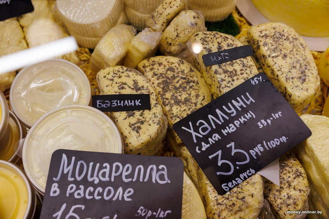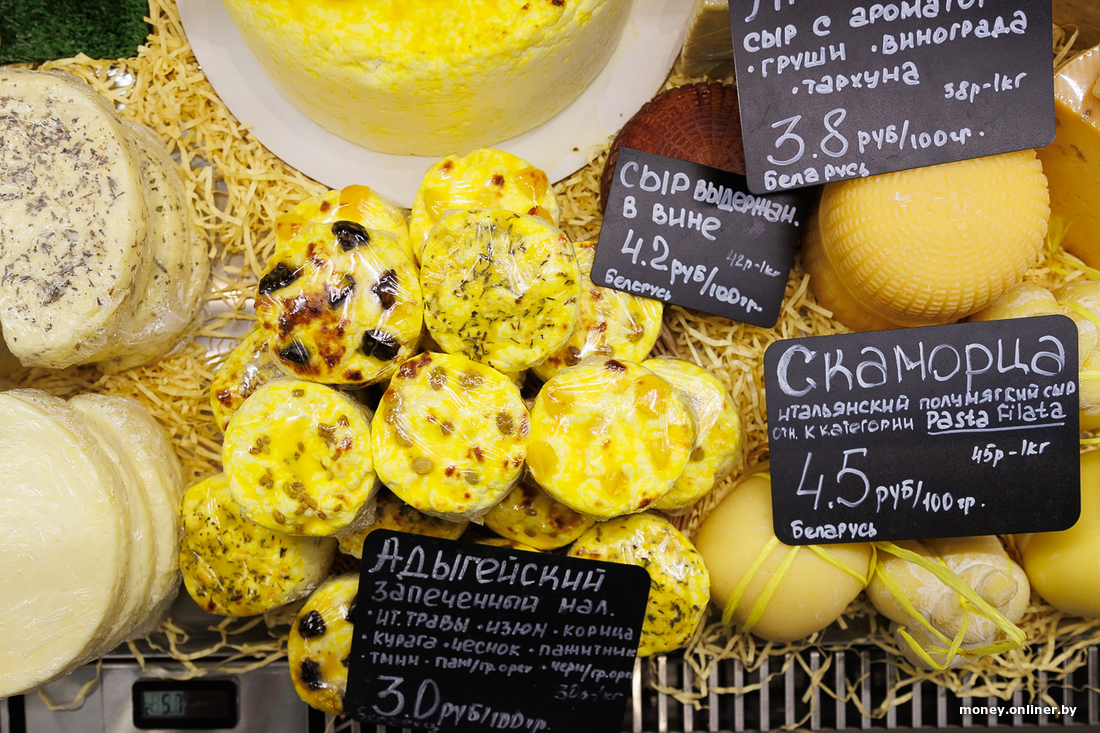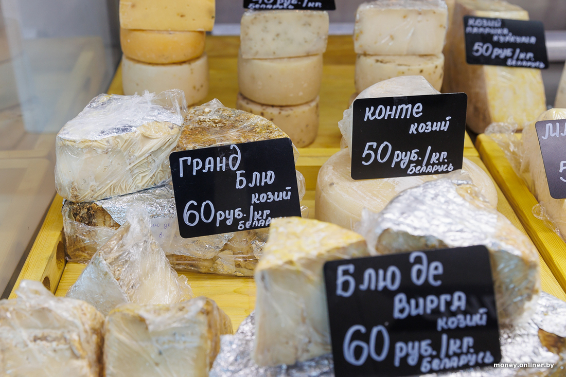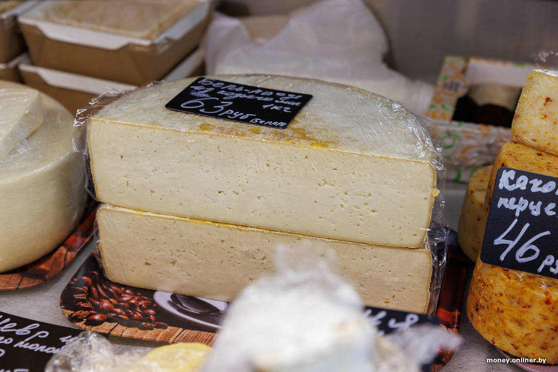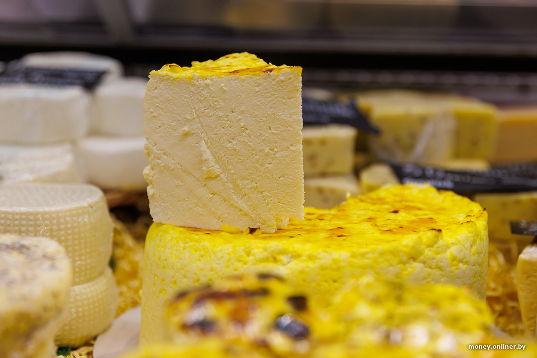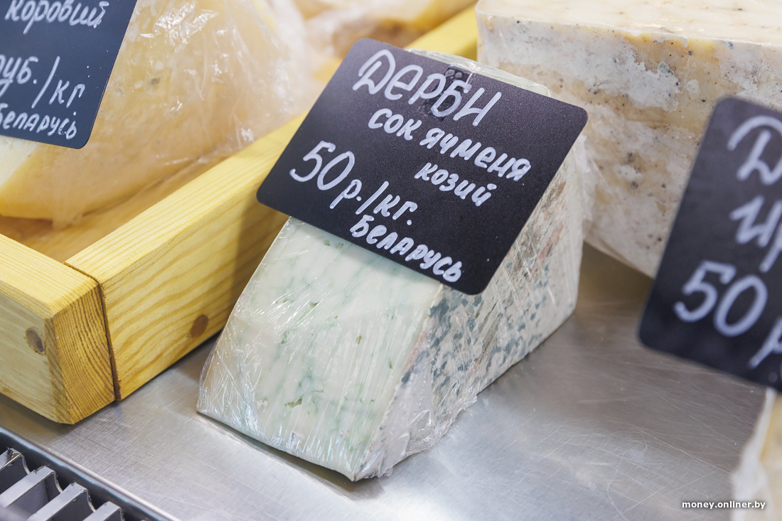 На прилавке сыры, названия которых многие белорусы никогда и не слышали: качотта, конте, гранд блю, дерби. В супермаркете можно найти сыр, килограмм которого стоит 20 рублей и даже меньше. Цены тут в разы выше, хотя и не астрономические: самый дорогой сыр мы нашли по 63 рубля за килограмм.