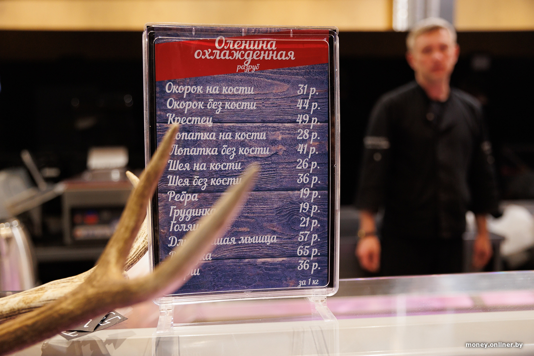 «Где вы сейчас найдете молочную телятину? А у нас она есть. Ни в одном магазине ее нет, только у нас, — говорит продавец. — И лань-олень — это наш суперэксклюзив, из охотничьего хозяйства. По вкусу лань очень похожа на баранину. У нас домашняя свинина, говядина. Если хотите, мы можем замариновать вам шашлык».