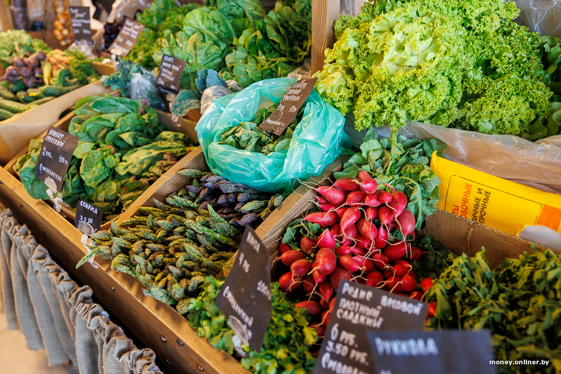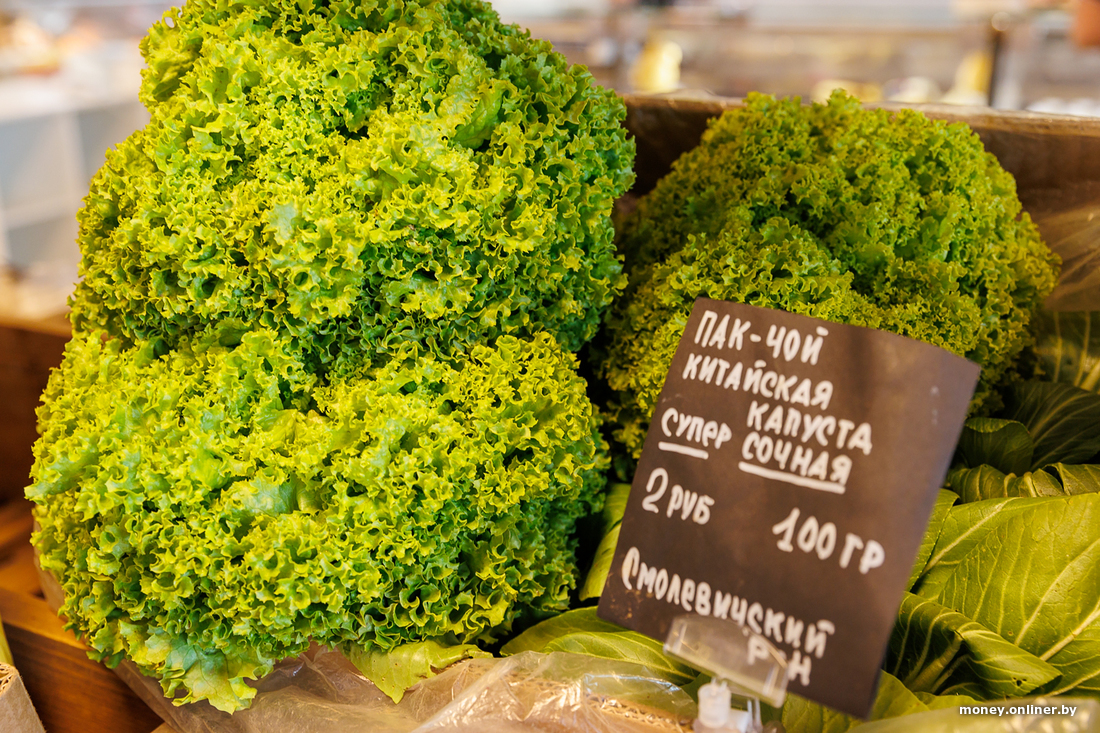 Спаржа уже не такой и эксклюзив, да и даже постоянные покупатели от нее подустали (предполагаем, что переели). Овощи, даже клубневые, уже помыты — людям так нравится больше. Спрашиваем у продавца: каким товаром гордятся больше всего? «Салаты, у нас их шесть видов (каждый по 2 рубля за 100 граммов. — Прим. Onlíner). Огурцы у нас пока из парника, а совсем скоро будут с грядок. И скоро помидоры пойдут, они уже созревают на ветках».