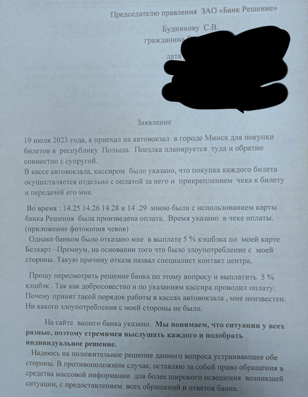 Я написал обращение в банк, объяснил, что покупка билетов по частям — это требование кассира, а не моя прихоть, что операция проводилась по частям из-за этого, а не потому, что кто-то захотел положить себе в карман лишний рубль.