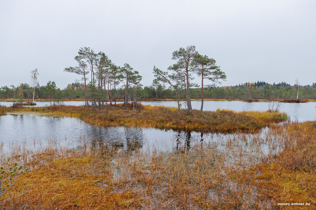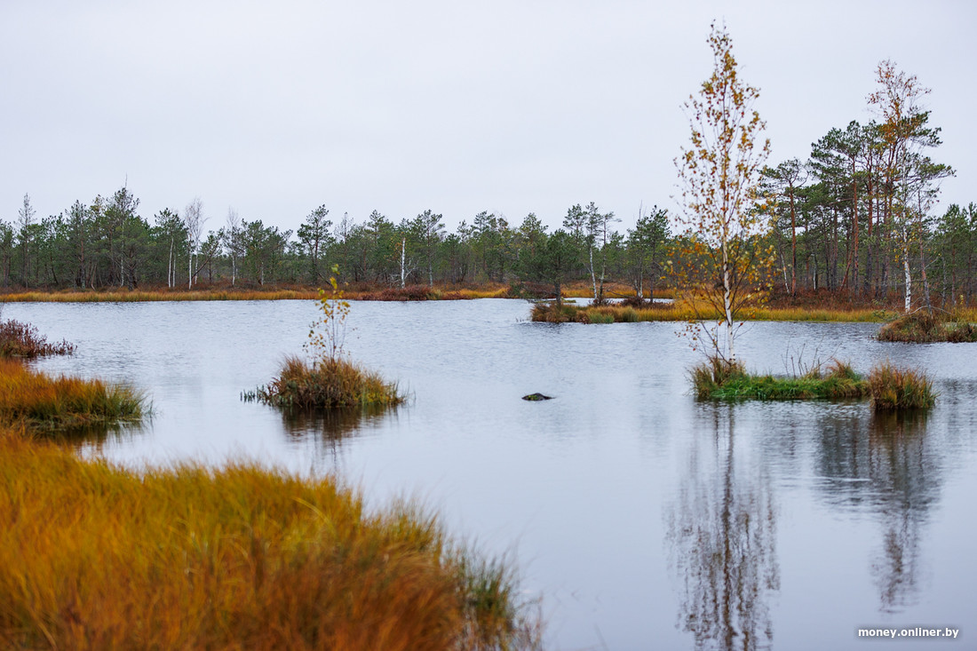 Сменилось и окружение: зеленый мох стал красным (теперь нужно напрягать зрение, чтобы заметить ягоду), низкая травка почти полностью погрузилась под воду, а из деревьев — лишь чахлые сосенки. Когда наступаешь, нога медленно погружается в топь, местами почти по колено, а на поверхность с бульканьем выходит вода. Ходить нужно непременно в сапогах, желательно рыболовных. Засосать по шею не должно, хоть почва и чавкает при каждом шаге.
