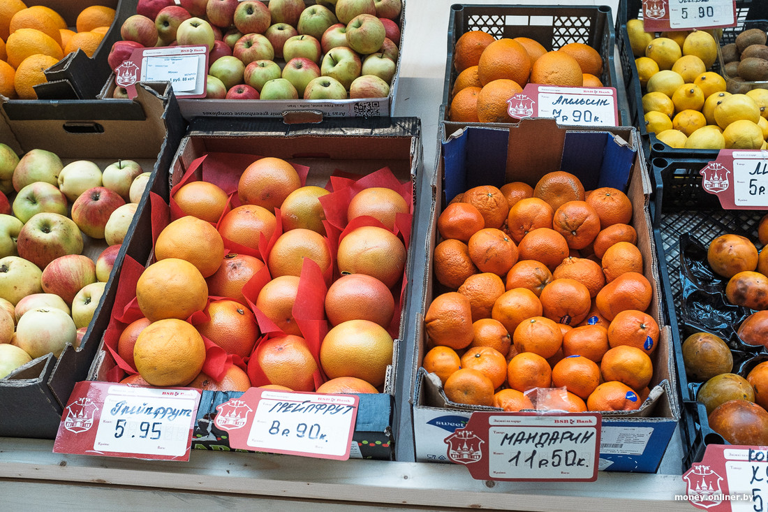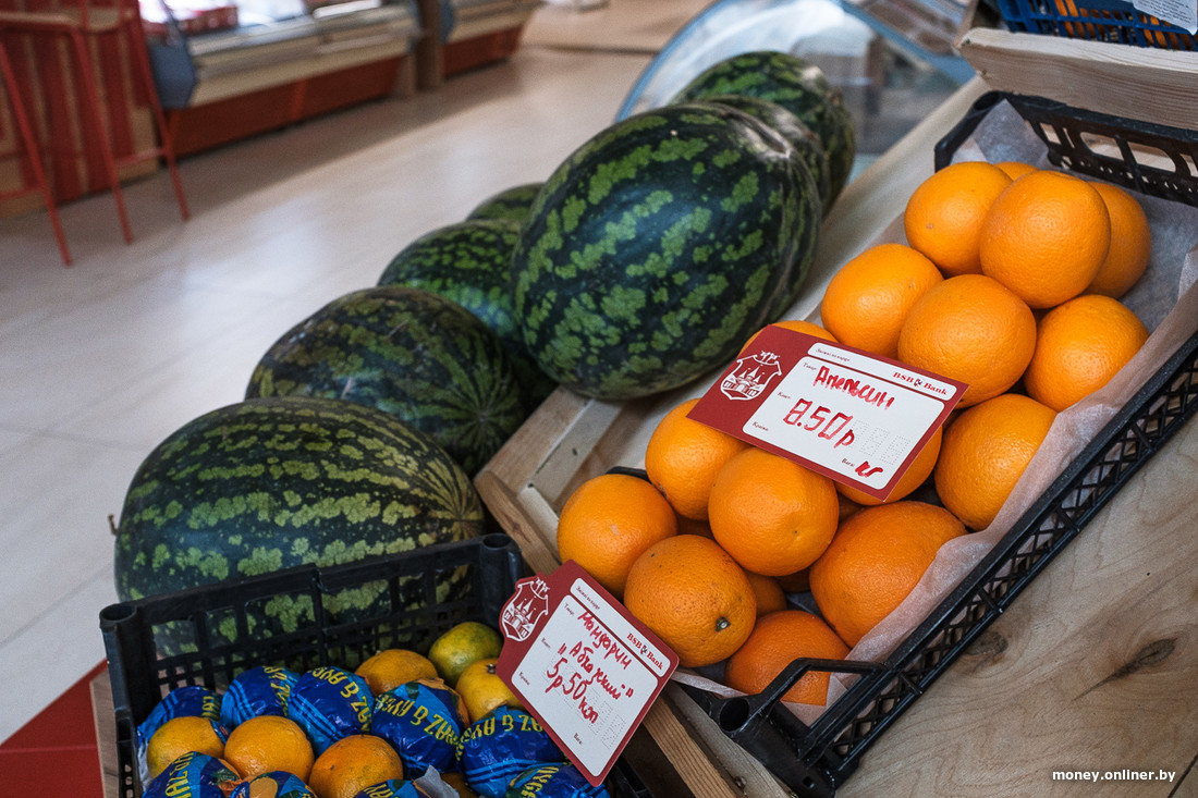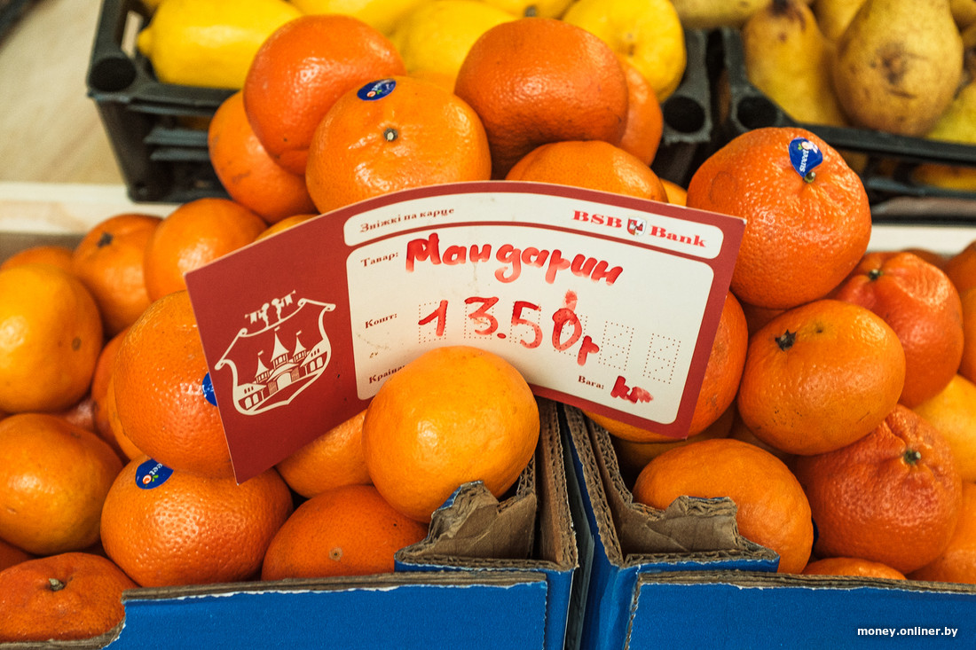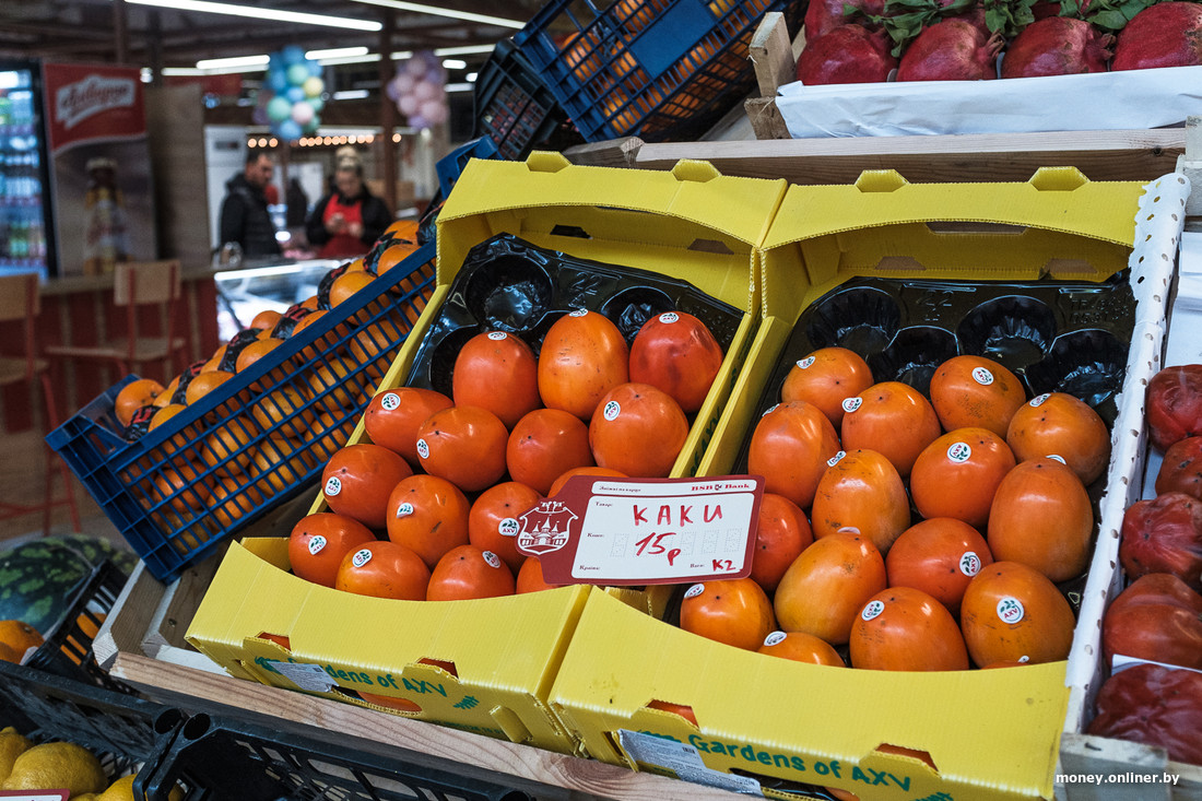 Раз уж мы всех мерим по мандаринам, то здесь их не так много. Есть абхазские по 5,5 рубля и просто «мандарин» по 13,5. Как уникальное торговое предложение — последние в этом году арбузы. Хурму, которую обозвали «Каки», отдают по 15 рублей за кило, грейпфруты — от 5,95, апельсины — по 8,5. Также есть огурцы по рублю. Они выглядят «уставшими», но доступными — такую цену в Минске на них не найти.