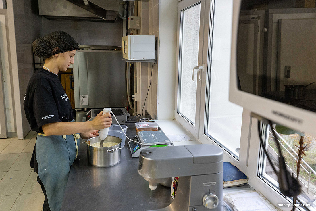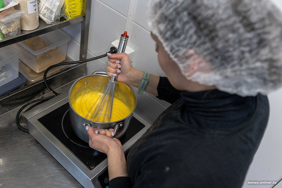 В эклерной на Грибоедова справляются два кондитера, практикант в цеху, бариста в зале. По мнению Олега, для идеальной работы персонала должно быть в два раза больше. В самом цеху обеспечена поточность производства: кондитеры делают заготовки для эклеров, кремы. Из оборудования тут морозильная камера (−14°C) и плюсовая камера (+2°C), миксеры, посуда, две печки, которые стоят $10 000. Зачастую кондитерские цеха — история подвальная, тут же все красиво, есть окна, чтобы кондитеры не скучали.
