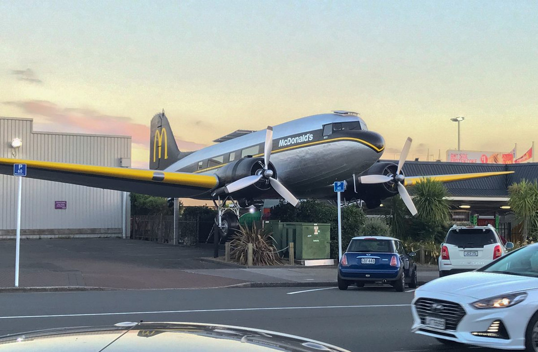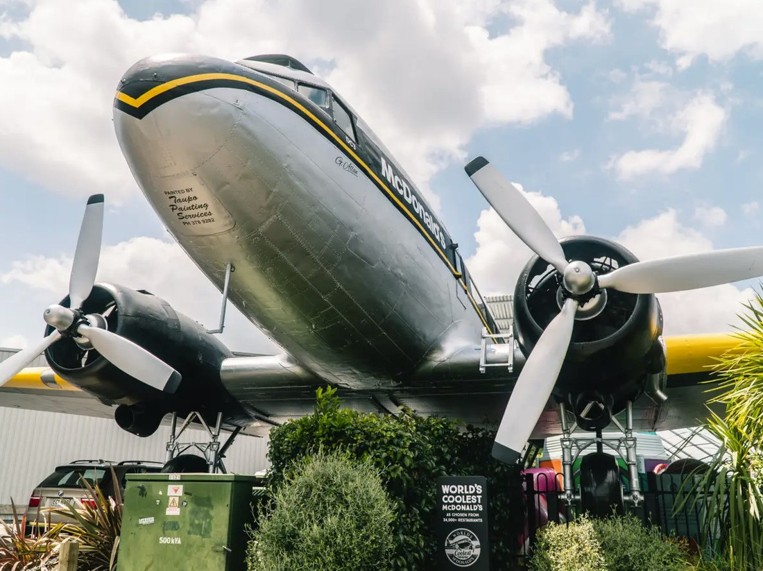 Самый настоящий Douglas DC-3 был построен в 1943 году (то есть когда McDonald’s еще существовал в единственном экземпляре), сначала летал на пассажирских авиалиниях, а затем применялся для обработки полей удобрениями. В 1984-м, после 41 года службы, его наконец списали. Самолет был куплен одним из автосалонов в Таупо и использовался в промоцелях. В 1990 году дилерский центр в свою очередь поменял хозяина, и новый владелец решил, что бо́льшую выгоду ему принесет фастфуд. В рекламном самолете оборудовали места для гостей, а стойки обслуживания находятся в соседней постройке. Посетители могут заглянуть в кабину пилотов или почитать информационные стенды, рассказывающие про историю воздушного судна.