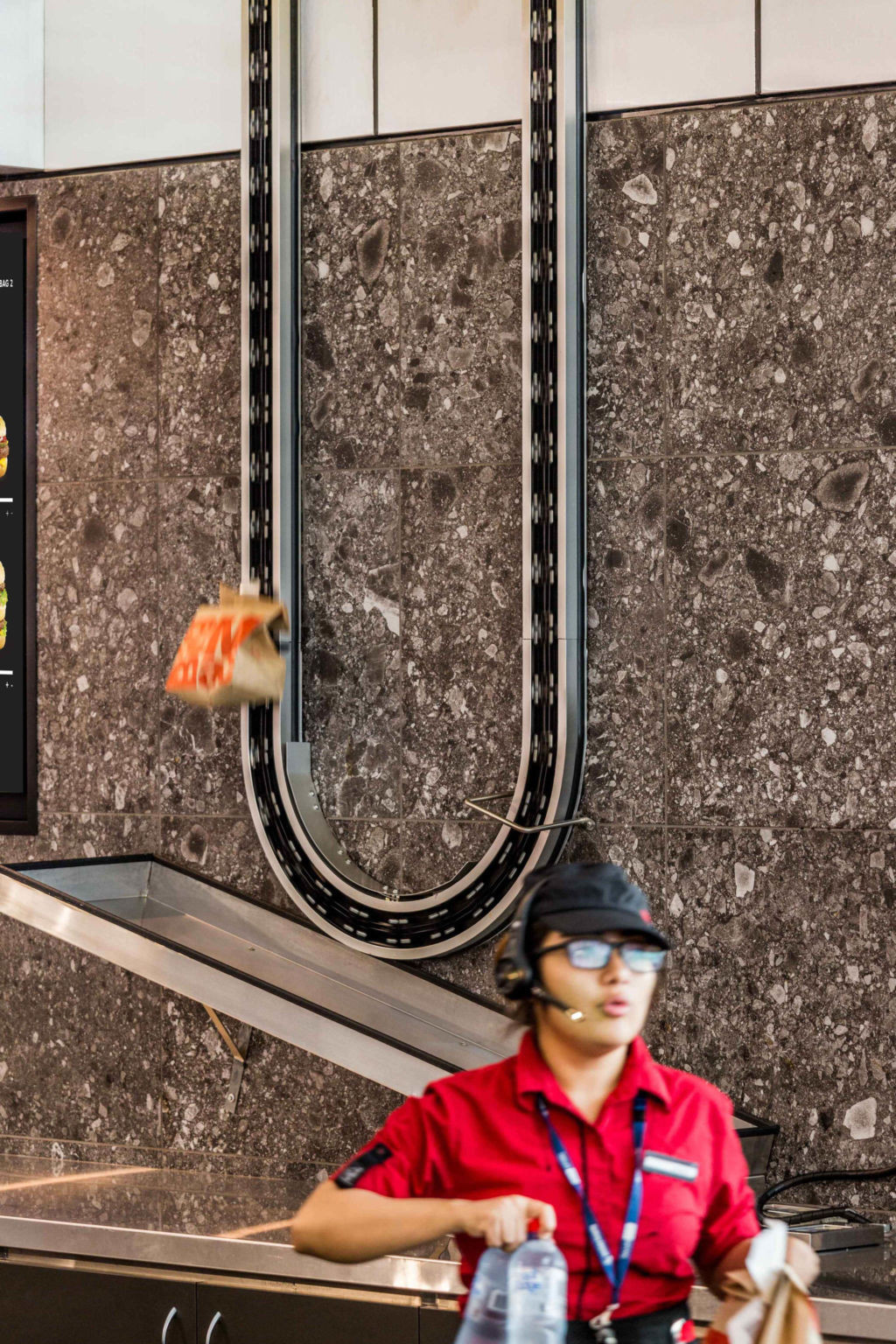 Авторы проекта предложили разместить кухню над стойками обслуживания и служебными помещениями, а в довершение «одеть» ее в полупрозрачный желтый пластик. Получившийся яркий результат сразу привлекает внимание и запоминается, поскольку позволяет наблюдать за работой поваров. Дополнительным аттракционом для гостей является специально разработанный транспортер, доставляющий их заказы с «Небесной кухни», как ее назвали, к кассам.