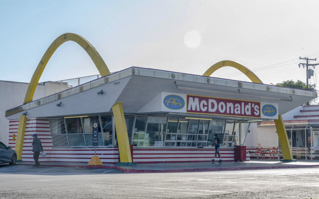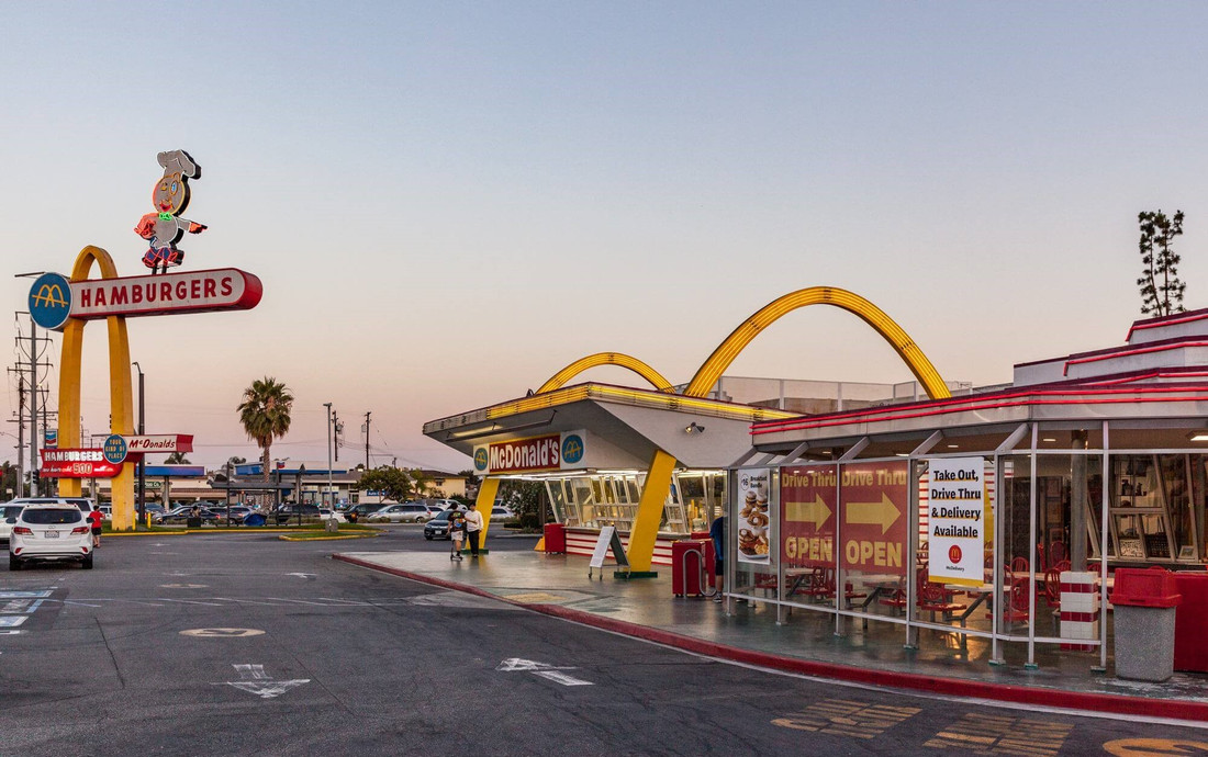 Начать логично со старейшего существующего McDonald’s в мире, тем более что он обещает своим гостям настоящее погружение в историю сети, когда она еще находилась на заре своего успеха. В принципе, ретродизайн встречается среди ресторанов с желтыми арками, однако практически всегда это стилизация, играющая на ностальгических чувствах. В случае же с McDonald’s, расположенным на бульваре Лейквуд в калифорнийском Доуни примерно в 20 километрах от Лос-Анджелеса, все обстоит честно.