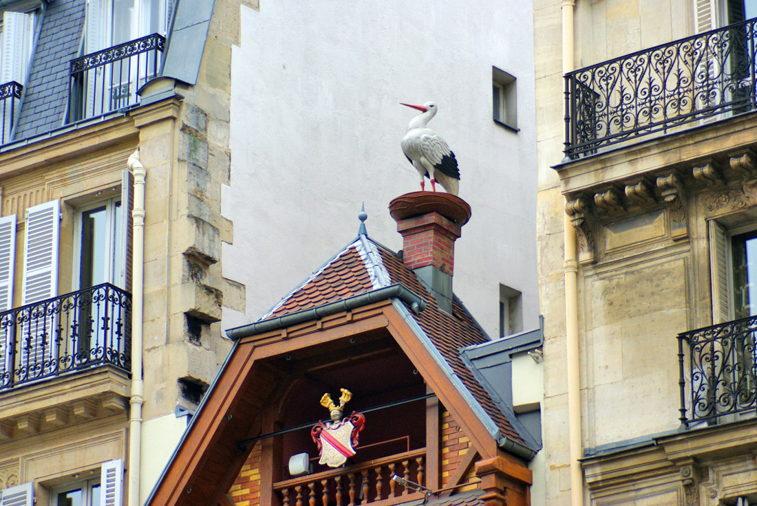 При этом оригинальный декор, включая изображения короля, сохранился, а верхушку здания украшает родной и нам аист, привычный некогда и на берегах Рейна.