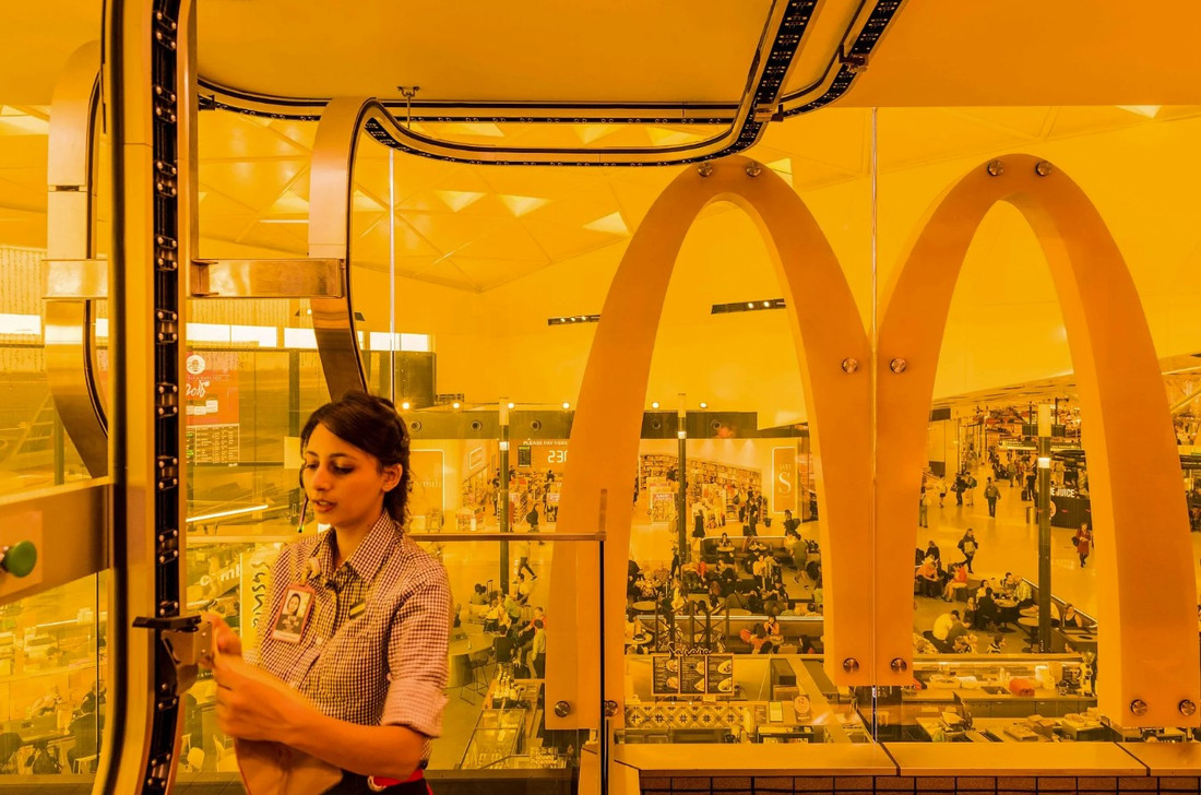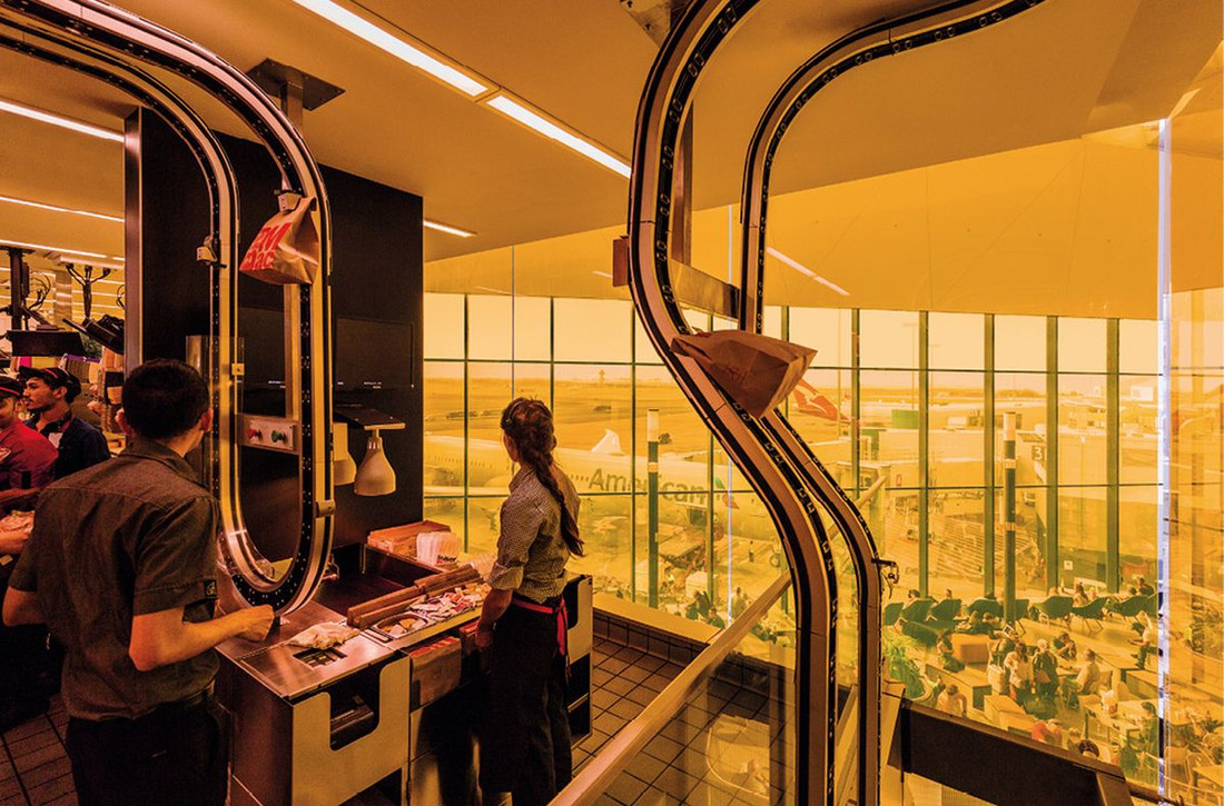 Следующий ресторан быстрого обслуживания работает в аэропорту австралийского Сиднея и мог быть очередным в ряду себе подобных заведений, кормящих голодных пассажиров, если бы не оригинальное дизайнерское решение. Местное подразделение корпорации в 2018 году объединило усилия с дизайн-студией Landini Associates и сделало эффектную запоминающуюся точку, которая максимально использует небольшую арендованную площадку в терминале №1.