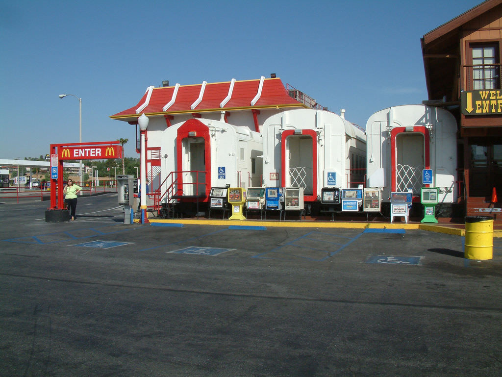 Раз есть самолеты, то должны быть и поезда. В Соединенных Штатах существует McDonald’s, который придется по вкусу любителям железнодорожной эстетики. В 1955 году вокзал, расположенный в калифорнийском Барстоу, закрылся, но ровно 20 лет спустя здание получило новую жизнь и с тех пор продолжает обслуживать посетителей — в основном транзитных туристов, направляющихся из Лос-Анджелеса в Лас-Вегас или в обратном направлении.