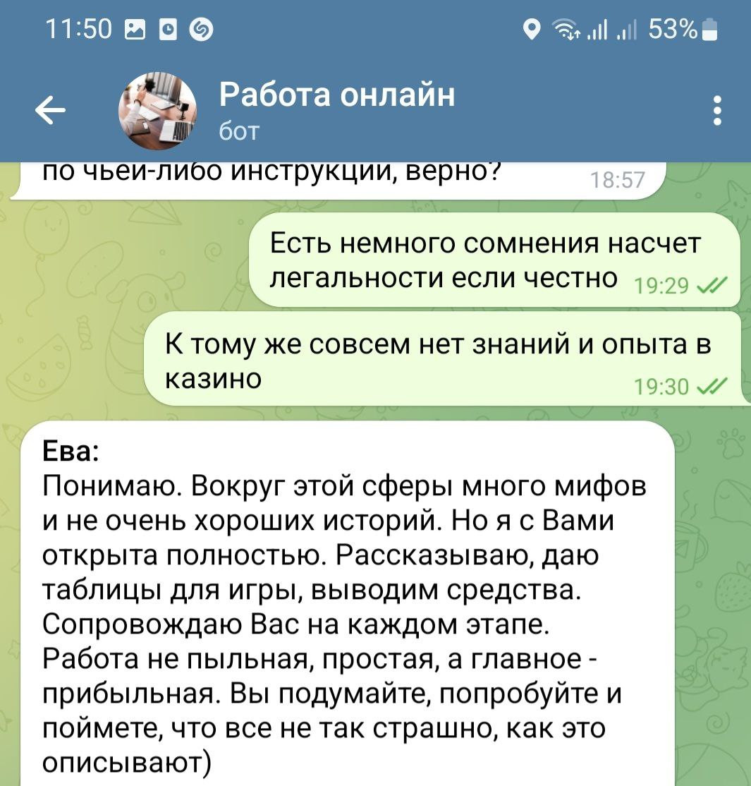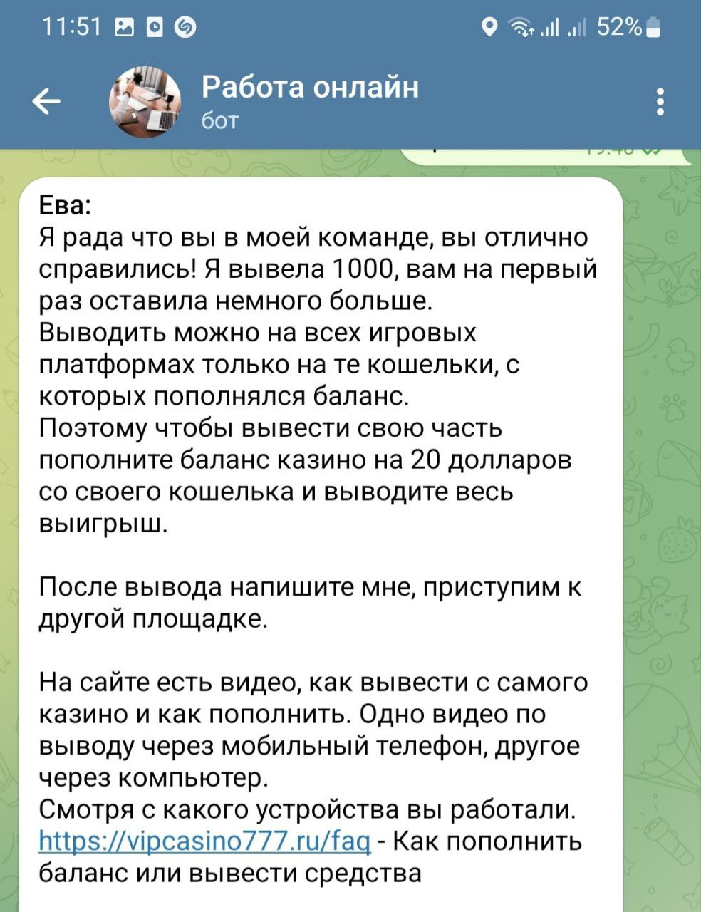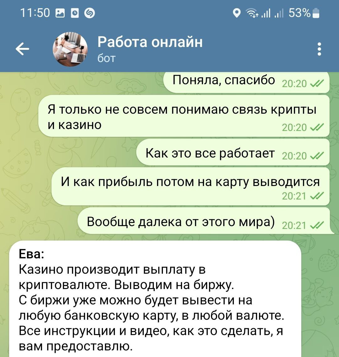 Виктория наткнулась на рекламу работы онлайн в Instagram с ежедневными выплатами. Спустя время уже в Telegram ей пришли подробности о сути работы. Предложили (всего лишь) обыграть онлайн-казино, следуя определенным стратегиям. «На то оно и казино, чтобы не рандомно тыкать на кнопочки, а стараться опираться хотя бы на какую-то логику и теорию вероятностей», — подумала девушка. Ведь делать ставки в определенной последовательности не запрещено законом. Она ввязалась в эту авантюру, забыв про золотое правило: казино всегда в плюсе, тем более если оно создано мошенниками.